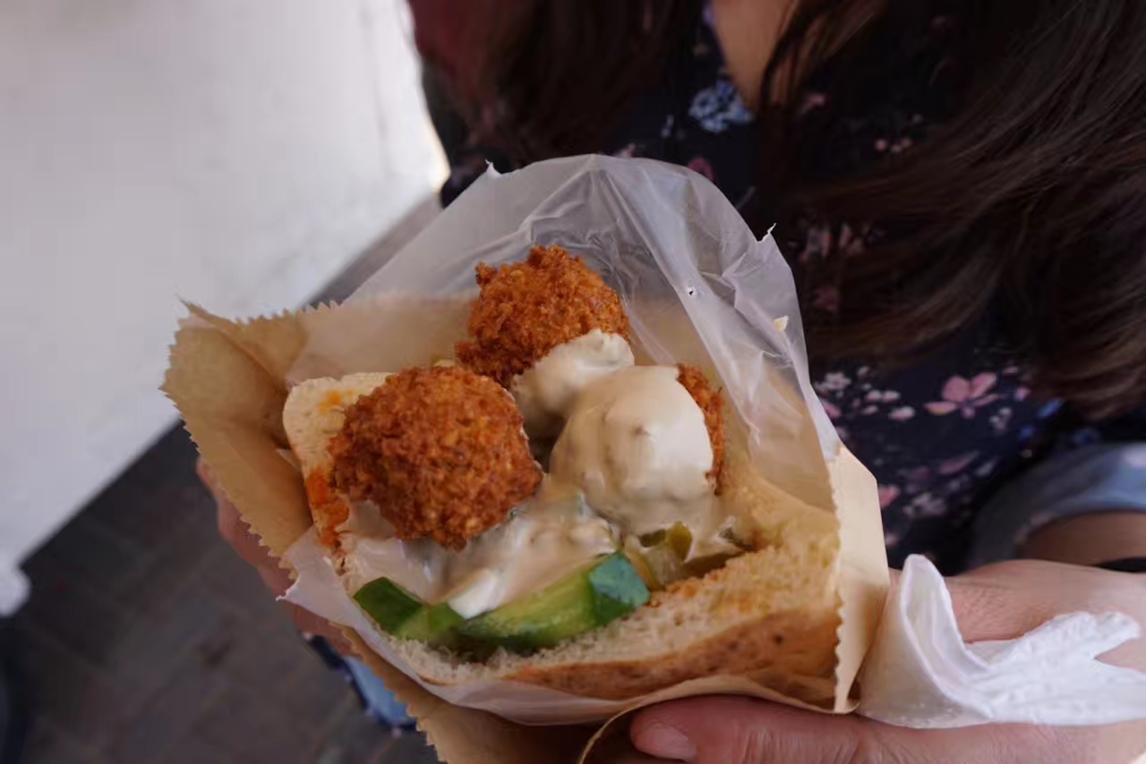 以色列哈代拉的街边摊买的这个叫Falafel,肉的成分多一些,最后也没弄清楚什么做的,总之吃起来还是比较怪怪的,并不难吃