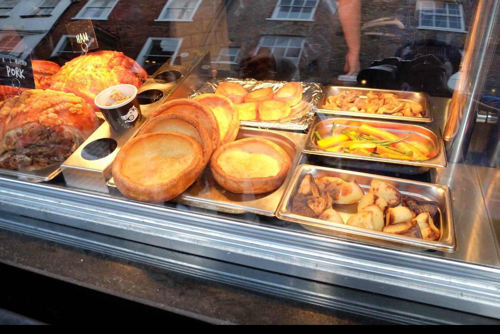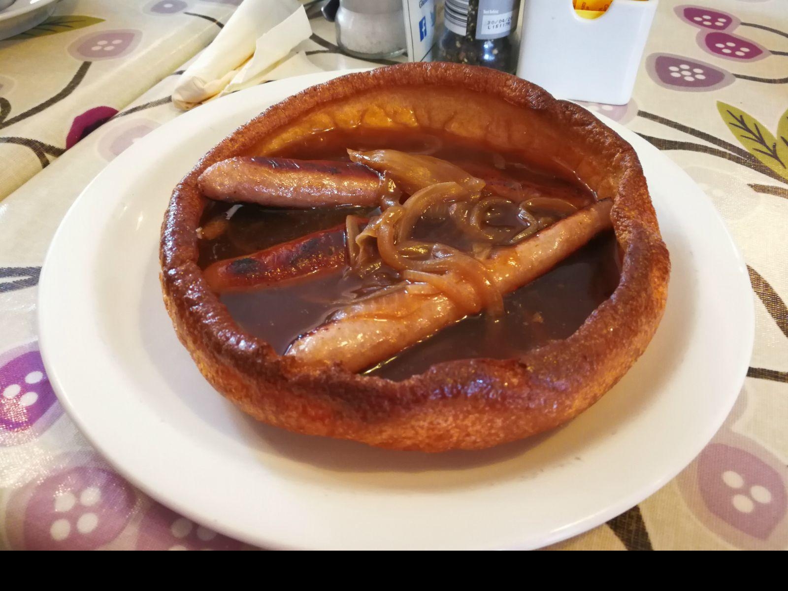 约克布丁是将面坯做成浅碗的形状入烤箱,烤制后外表皮特别是碗边部分焦脆,碗底厚实有韧性,盛上各种汤汁和配菜也不会漏,一般是配牛肉或者香肠,也有猪肉或全素的,配菜常常用到洋葱。照片中的是约克超级大布丁配香肠,这份吃食自带主菜、汤和面包,味道还不错。