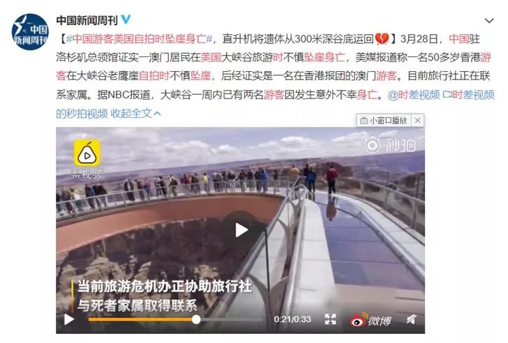 这个世界没有后悔药,生命只有一次!可偏偏有些人不相信,非得要用自己的生命去玩刺激。根据中国新闻周刊的报道,3月28日,一名中国澳门居民在美国大峡谷旅游拍照时不慎坠崖身亡。目前尸体已经从谷底运回,旅行社正在联系家属。3月28日,中国驻洛杉矶总领馆确定:一名中国澳门游客在亚利桑那州大峡谷旅游时不慎...显示全部