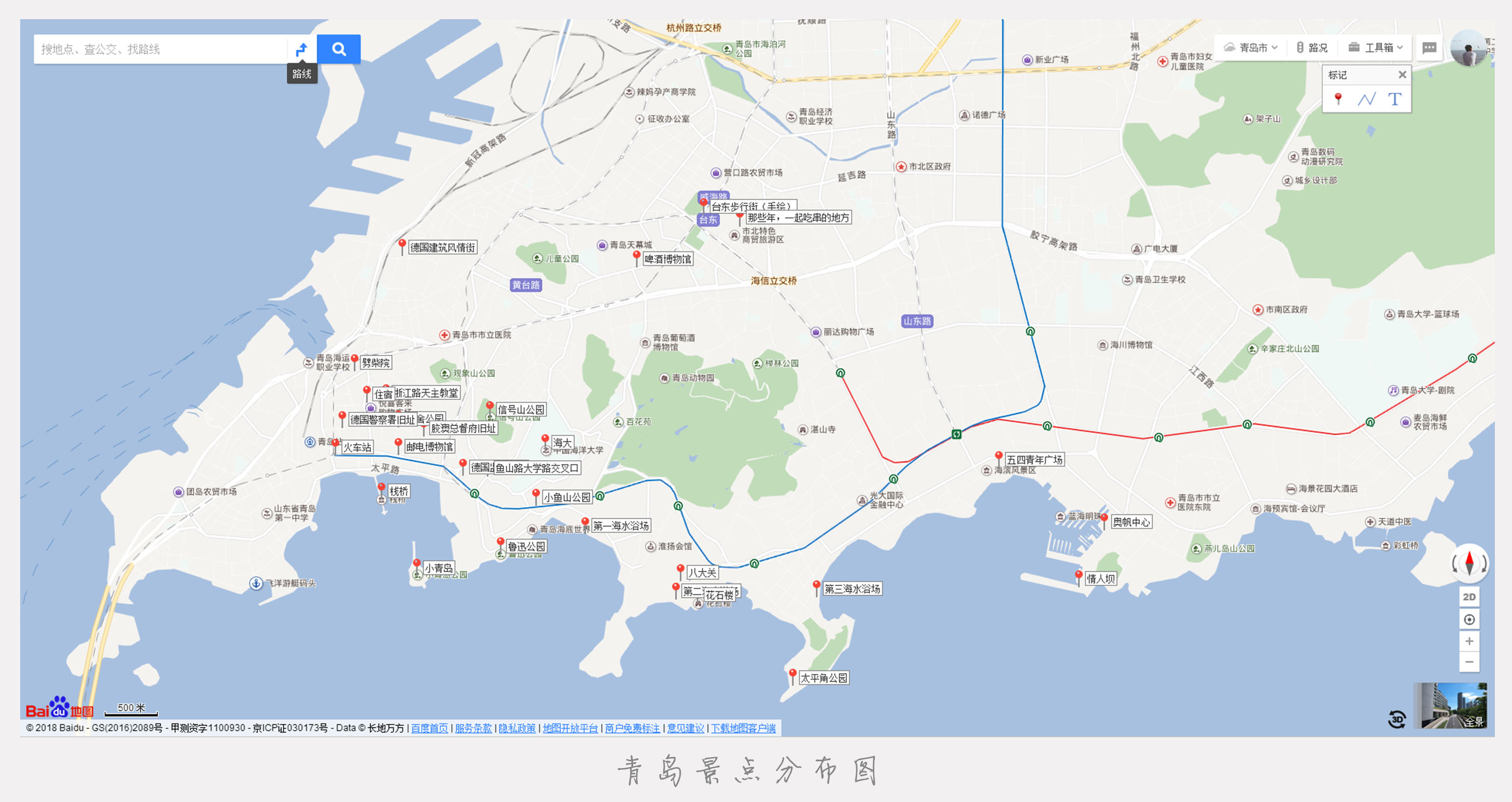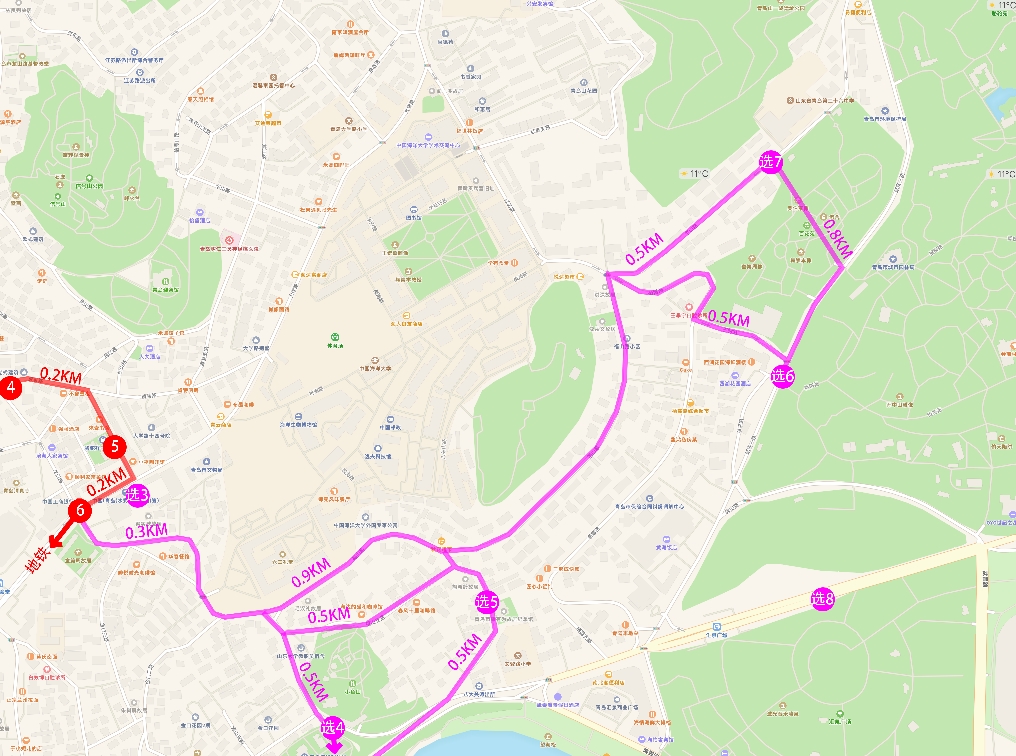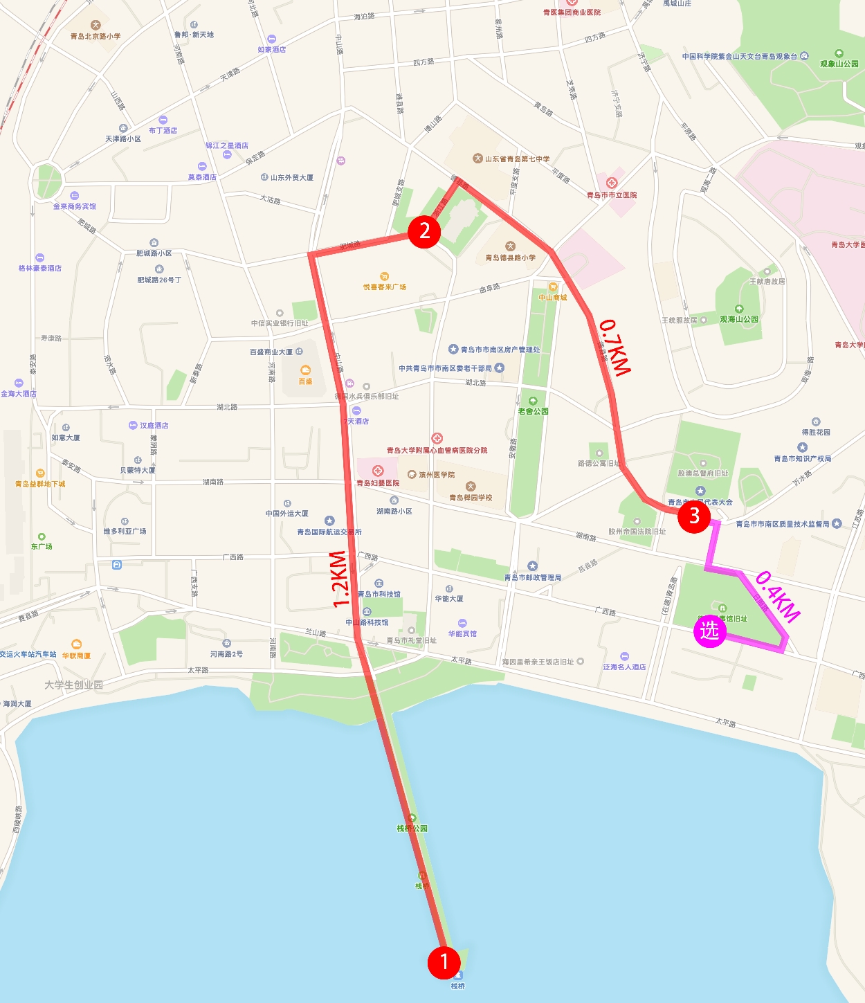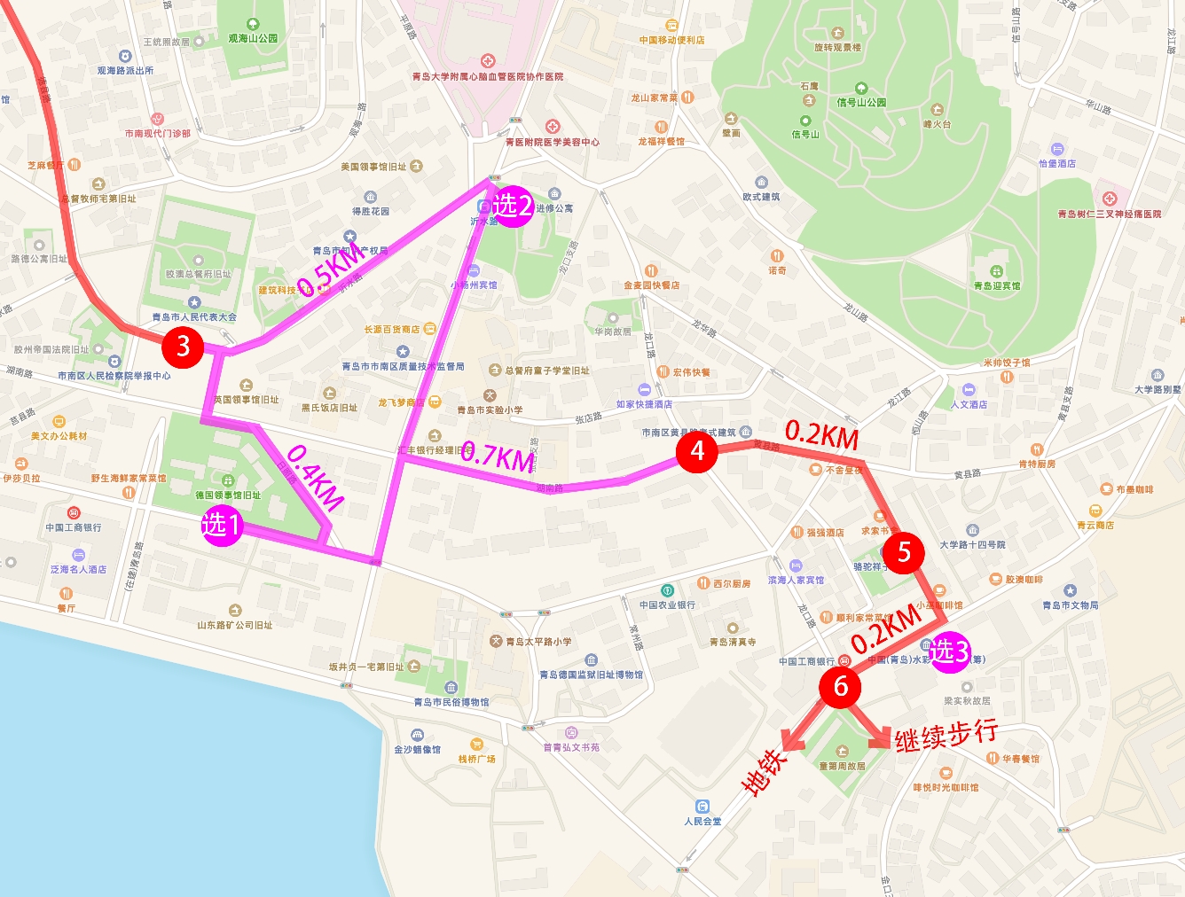 如果你选择继续前进,有几个点可供你选择。【选择4:海底世界】,【选择5:小鱼山名人故居】,【选择6:百花苑】,【选择7:中山公园】,【选择8:汇泉广场】。路线不是固定的,不比按照我下图画的路线来走。