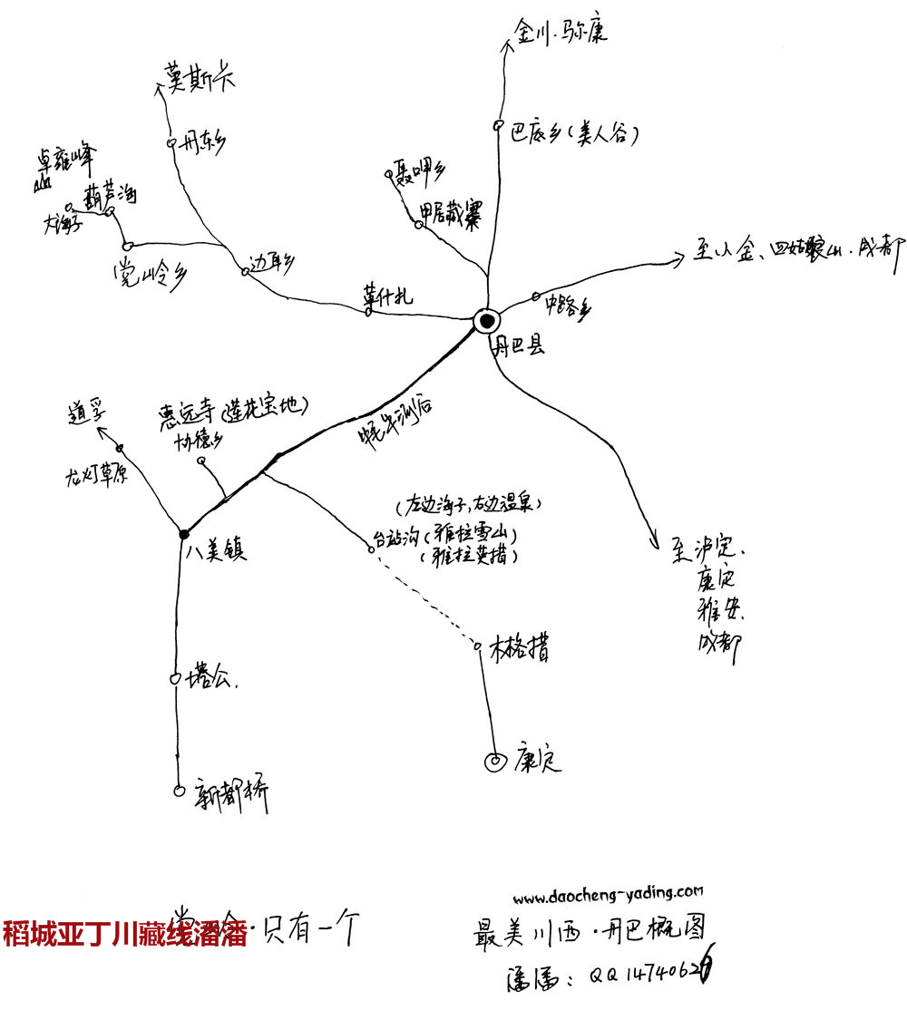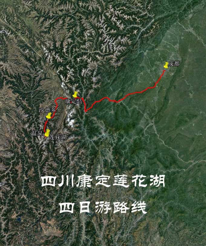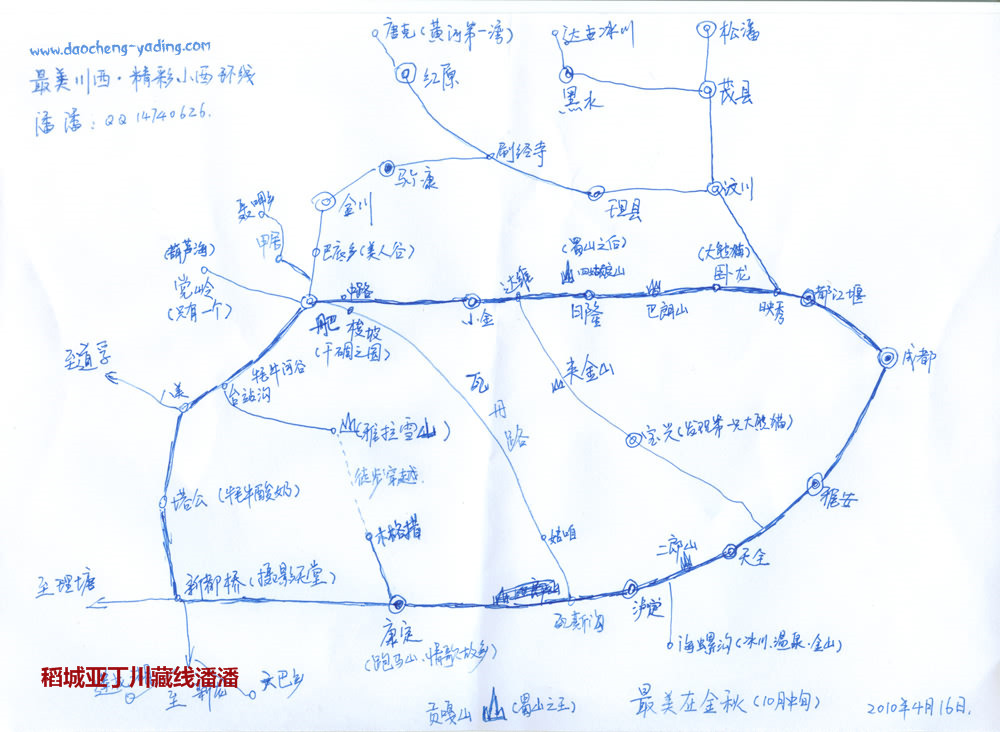 、塔公镇、八美、牦牛谷、丹巴、小金、四姑娘山、巴朗山隧道(当时前往垭口公路严重结冰,交通管制禁止通行)、映秀镇回家(德阳)。