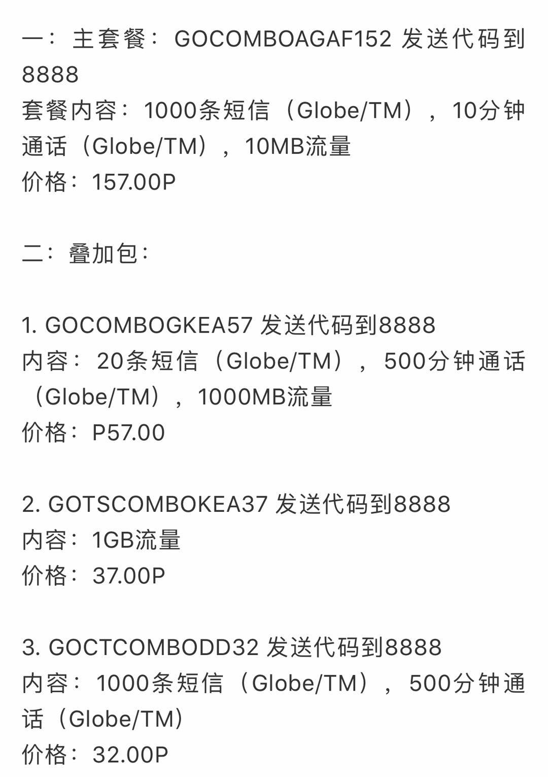 在菲律宾10天度假,我建议买Globe卡,相当于国内的"中国移动",在主要经济发达的城市与地区信号都还可以,在人迹罕至的海岛或山区由于没有这里足够数量的基站,任何手机网络都不给力,我也附上了这里的华人常用GLOBE的套餐使用方法,如果1G使用流量不够,可以以信息方式输入G...显示全部