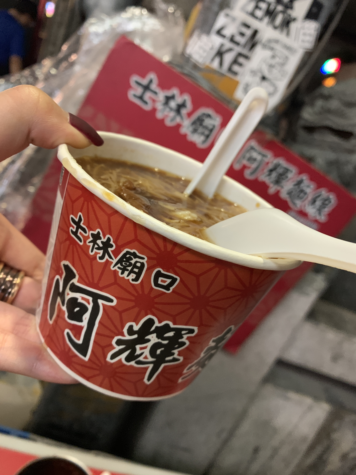 至于阿宗面线我没吃到,人太多了,我在士林夜市吃了阿辉面线,摆在庙门口,庙门口的楼梯上坐了几排人在吃!我看到这场面,一定要尝尝啊,结果。。。真的很好吃!