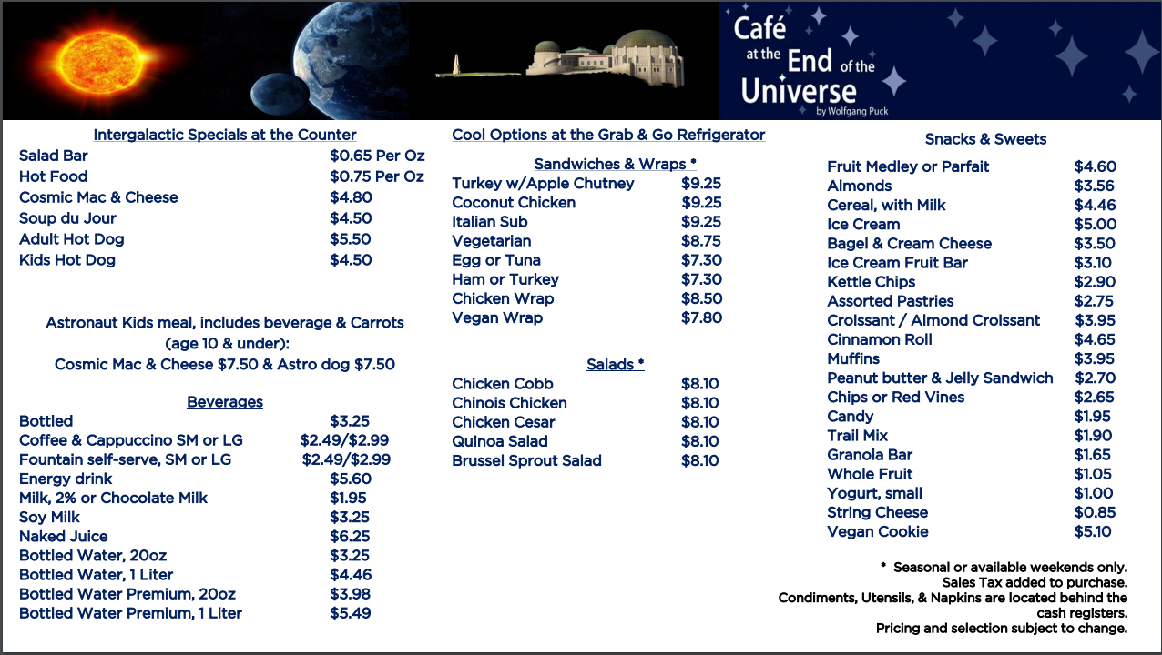 格里菲斯在山上,附近没有吃的,里面就一个咖啡吧 Café at the End of the Universe。菜单如下: