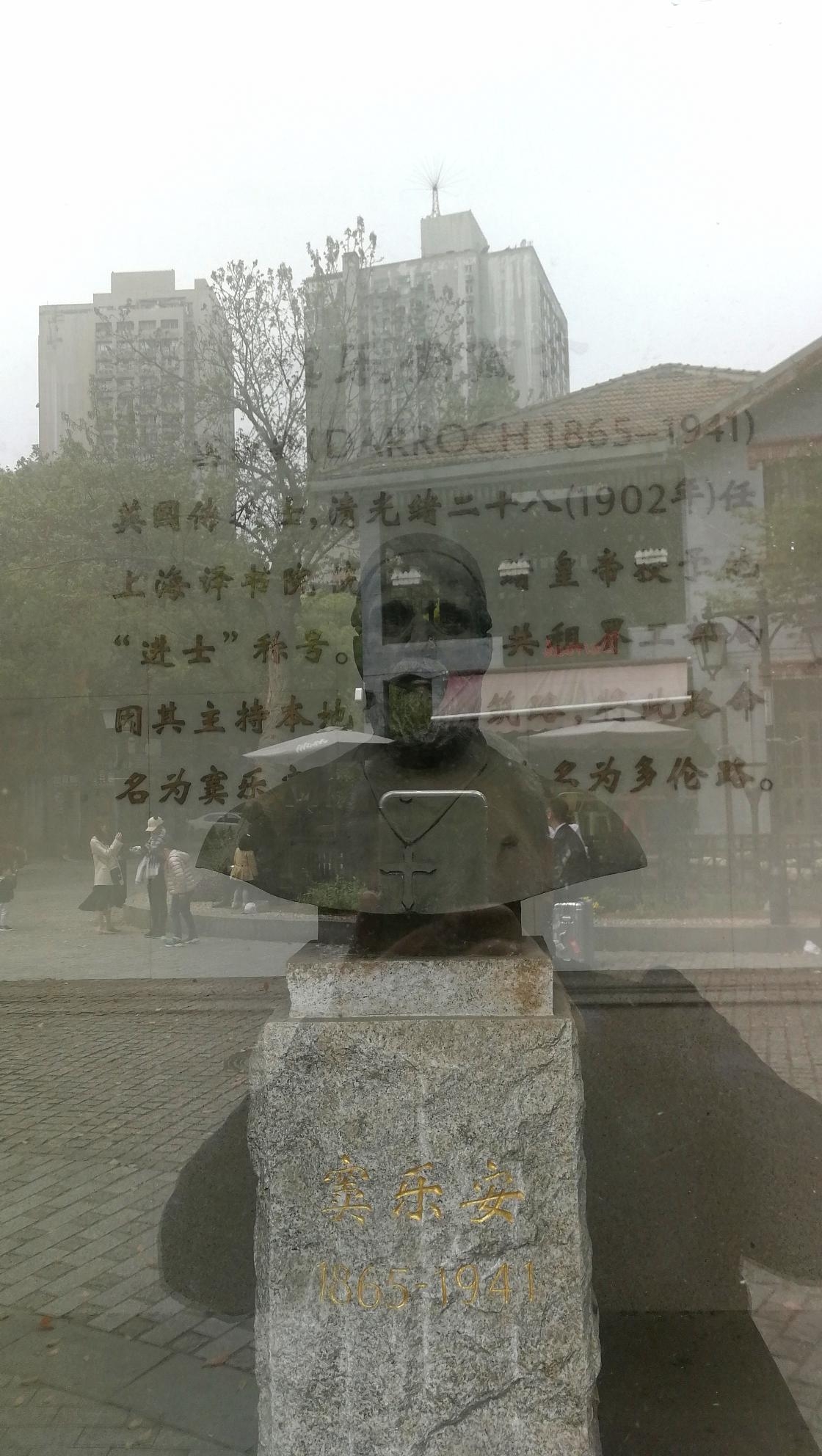 在“夕拾钟楼”底部的玻璃窗内安放着窦乐安的胸像(透过玻璃窗用手机拍照有点模糊不清)