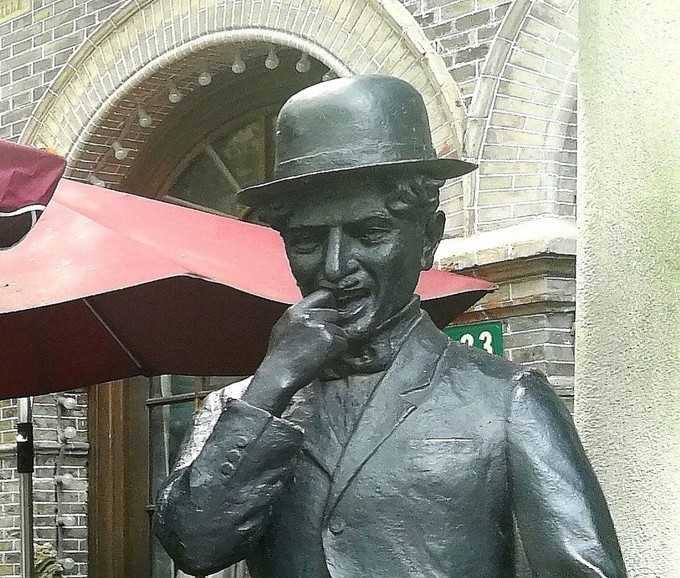 “站”在“老电影”的咖啡馆前当门童的是卓别林,为老板做广告,招揽顾客。