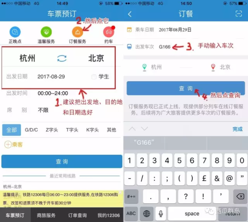 您好~如果可以帮到您的话,希望采纳! 高铁上也能点外卖送到座位上了,享受铁路VIP服务~在微博上看到有人讨论高铁的哪一站外卖比较好吃,怪自己孤陋寡闻竟然今天才知道高铁也能吃上热腾腾的饭菜。而且便宜好吃Step 1:下载 「铁路12306 」APP,就是唯一铁路官方软件。Step 2:...显示全部