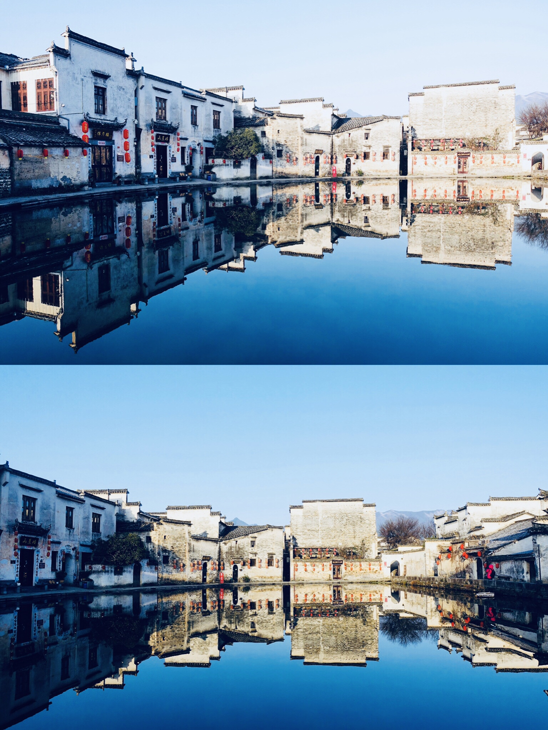 5,宏村建村初期,因发生过火灾,所以请风水师来改善,修建了完善的水利设施,而水也为宏村增加了灵动之美。拍摄时可以水面为中间线,让实景与倒影各占一半