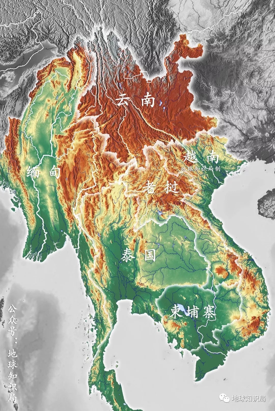 越南和老挝之间的长山山脉深入两国内部,构成了老挝中北部主要的山地国土,也让越南除了一长条沿海平原外缺乏平地。缅甸东部和