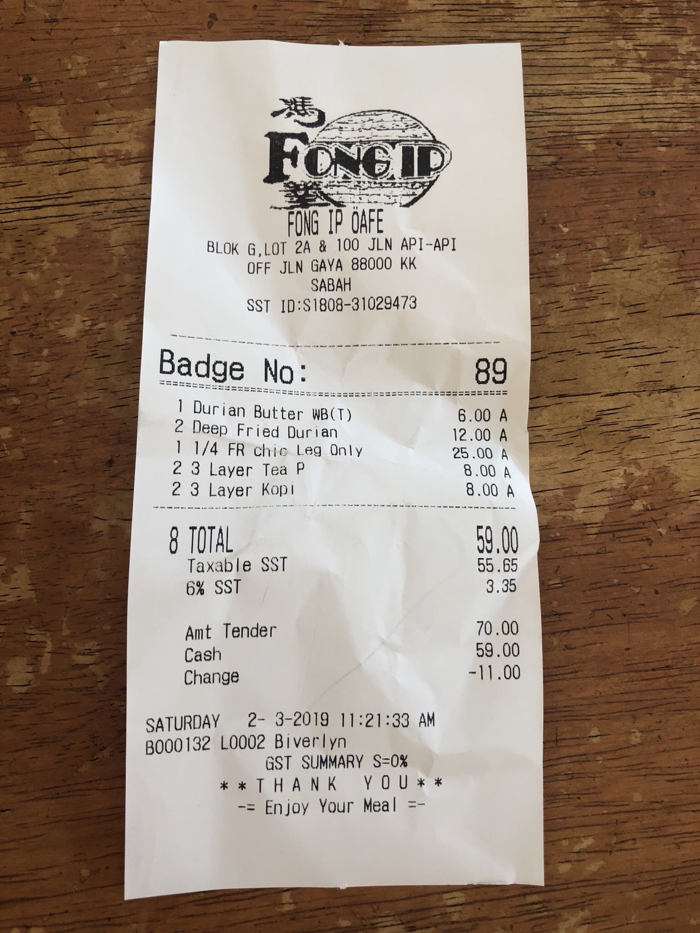 冯业茶餐厅账单,含6%的服务费。
