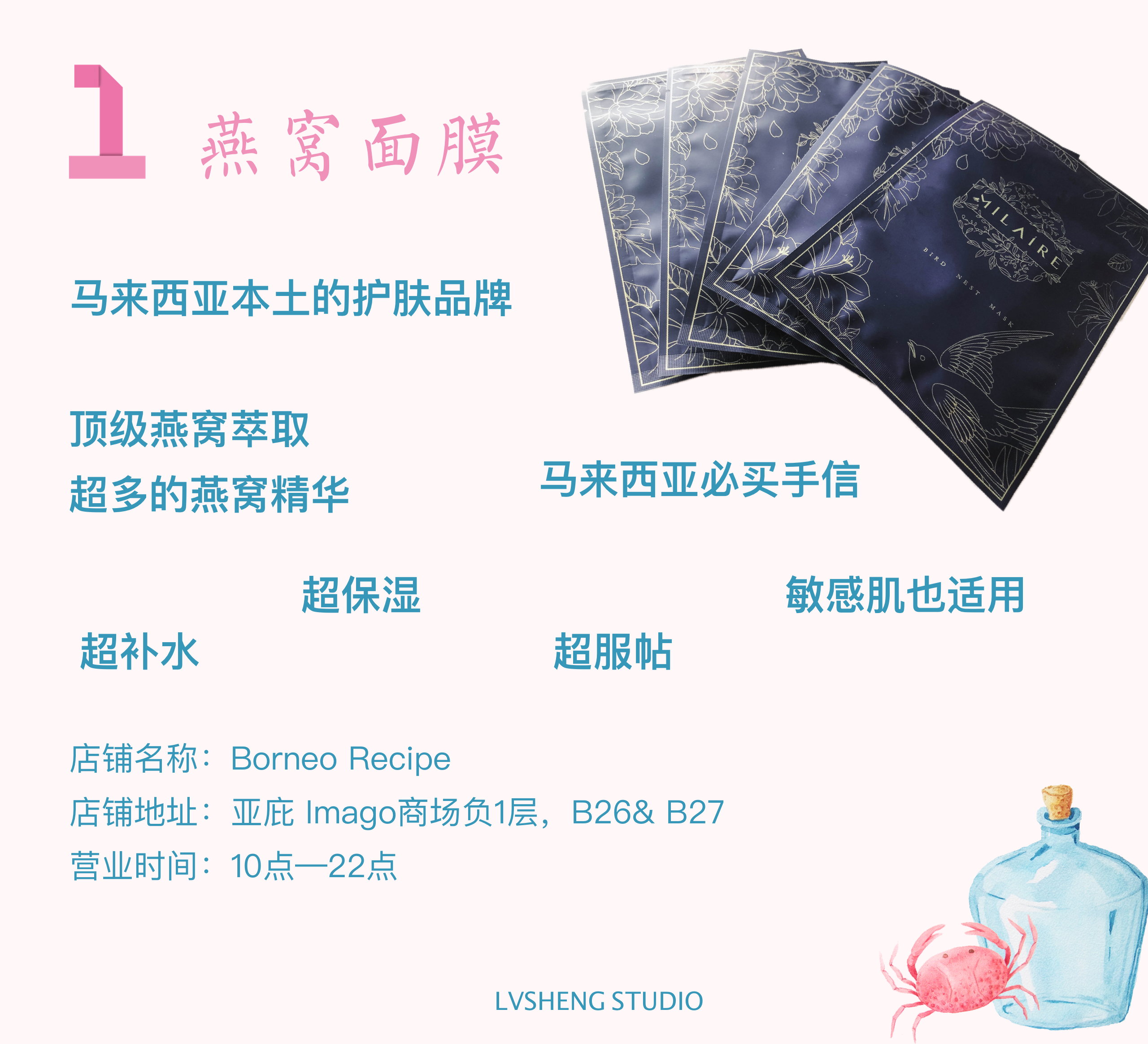 燕窝面膜,听着燕窝2个字,可不要被这2个字吓到。这款面膜是马来西亚自己的品牌,价格也属于中等,绝对是送礼或者自用可以考虑入的实用产品。我自己是有用过这款面膜,补水效果很不错,长期用,我觉得毛孔还有缩小。强烈推荐题主买燕窝面膜。目前燕窝面膜只在IMAGO商场负一层的Borneo Recipe有售,据说后期会进入机场。我多啰嗦几句,题主最好不要在马来西亚买燕窝;马来西亚是允许带燕窝出境的。但是❗️❗️❗️中国是允许生物制品入境的❗️❗️❗️所以推荐题主买燕窝面膜,这个就可以大大方方的带回国内了。