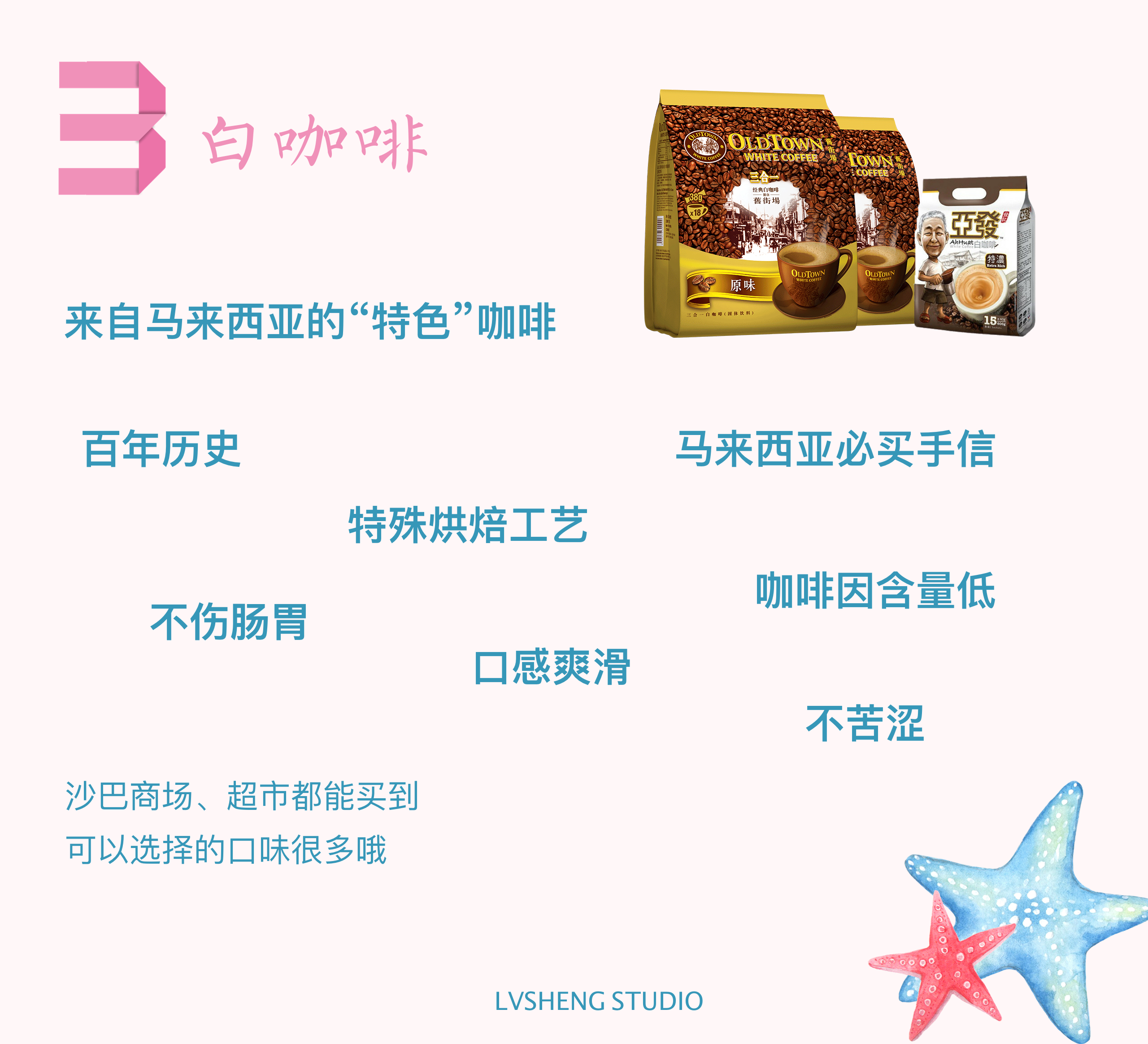 这个基本上属于去马来西亚必买的手信了。这个也是很经济实惠的马来西亚特色手信了,价格在10-20马币左右。白咖啡和我们日常喝的咖啡来比较的话,就是味道有差异。白咖啡其实就是咖啡豆子烘焙程度不同而已;白咖啡一般是轻中度烘焙。我们从味觉上会感觉到比较明显的差异,不会很苦、不会很涩。白咖啡的咖啡因含量也是比较低的。题主可以买白咖啡送人,也是比较好的。市面上的白咖啡基本都是含奶的,所以冲泡而言是非常简单的。