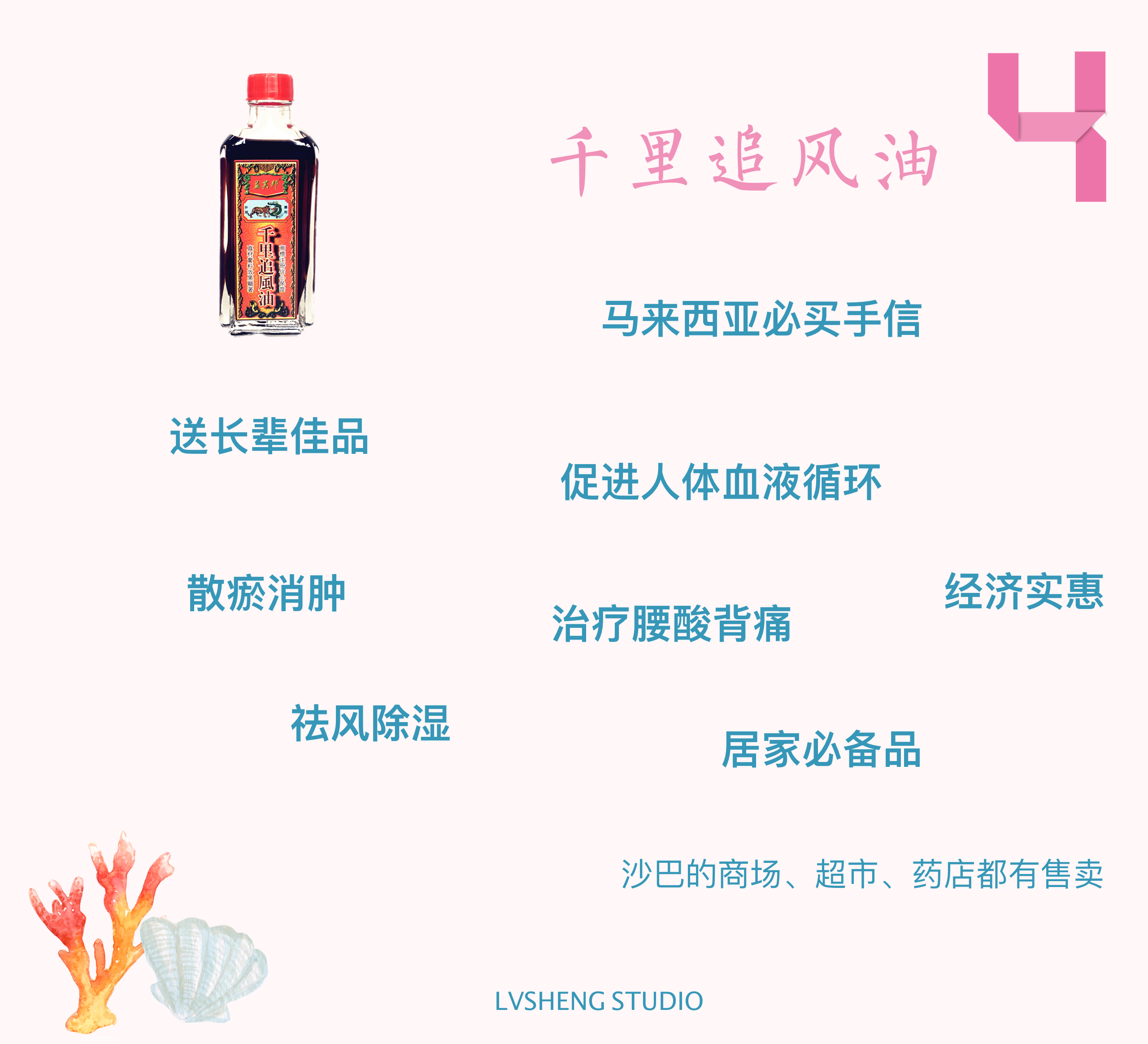 追风油及千里追风油,行销马来西亚,远近驰名,有口皆碑,药料珍贵、成份准确、功效快捷、气味清纯芬芳、不污衣服,渗透人体细胞组织,促进人体血液循环、驱除疾病痛苦、迅速恢复健康,治疗内科外科各症均无刺激不良之弊,而且有伟大治病防病安全功效,实诚居旅常备永保平安之神奇特效药油。【以上内容来自百度百科】这个产品几乎是每个旅行社都会带去购买的一款产品。它有没有效果呢?还真有,我婆婆每次腰酸背痛,都会拿千里追风油来擦。她的感受是不错的。