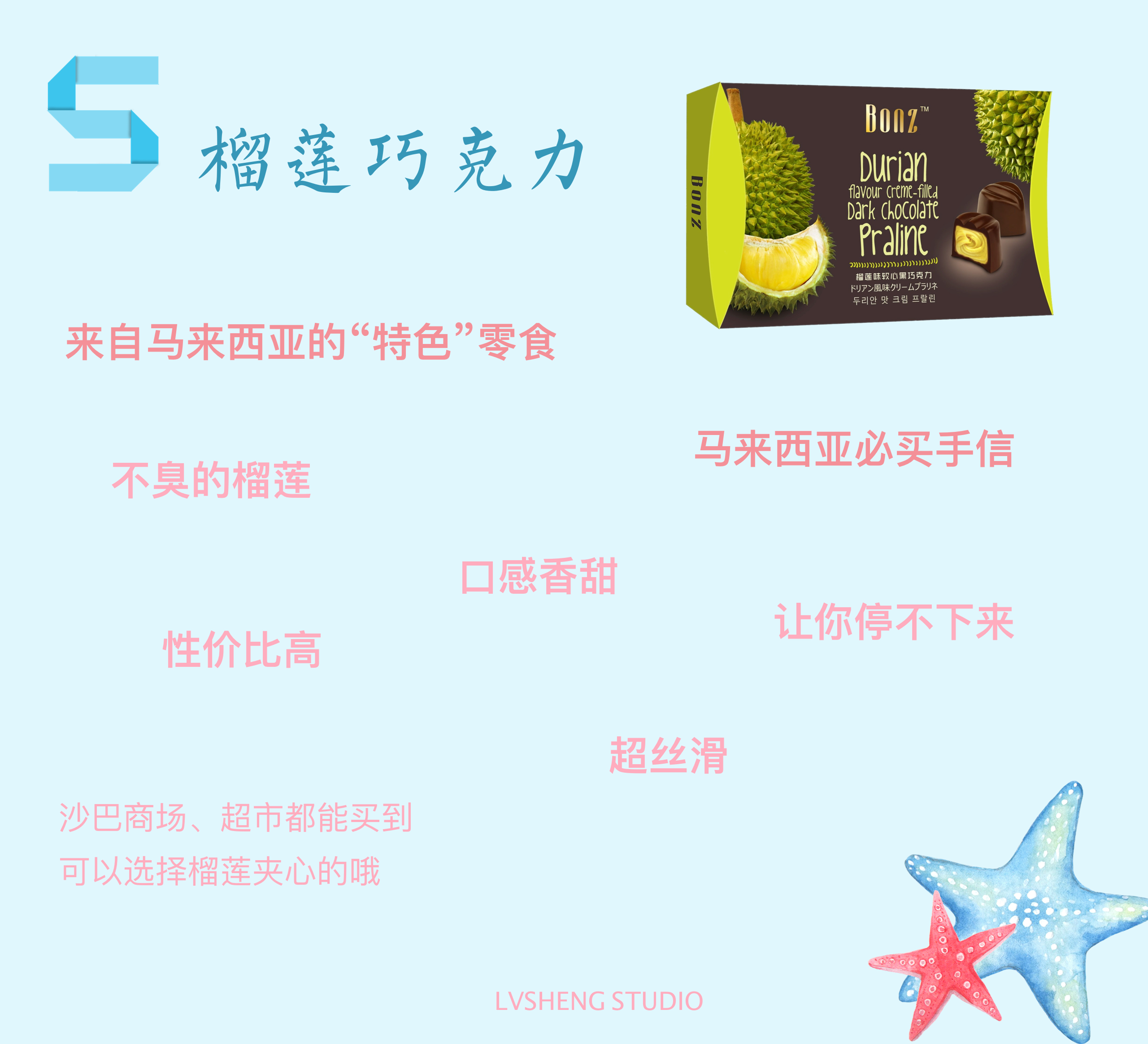 提起马来西亚,我们通常会想到榴莲。你到了马来西亚吃了马来西亚榴莲,你肯定不会在想泰国榴莲了。很多人会对榴莲的味道感觉接受不了;那么榴莲巧克力是值得一试的。就我个人而言,榴莲+巧克力=升华了巧克力的口感。如果题主喜欢榴莲,可以试试带夹心的榴莲巧克力。