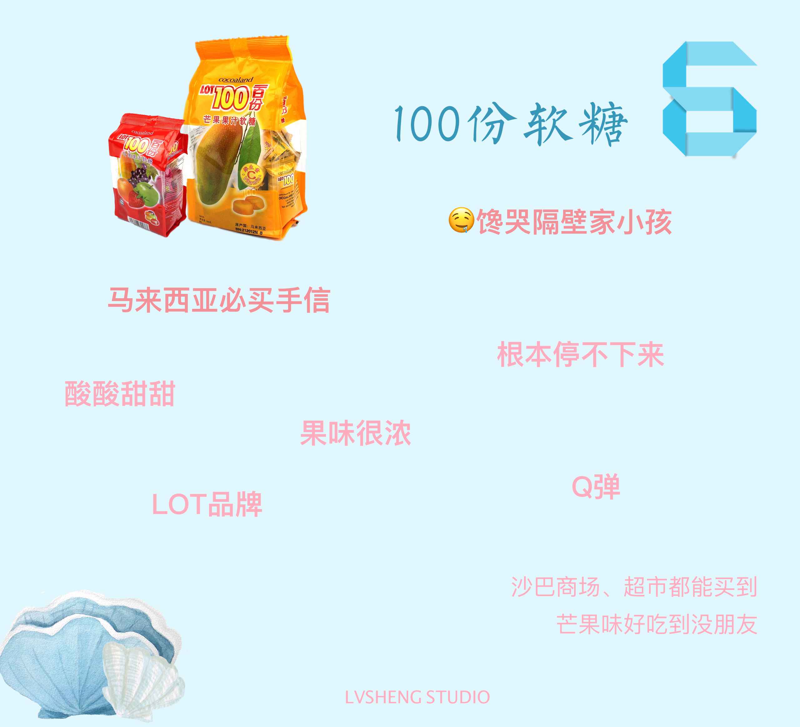 题主,你一定要买这个糖啊!来自马来西亚的"QQ糖"!!!芒果味酸酸甜甜特别好吃,在马来西亚这么炎热的地方旅行,很容易没有胃口的。吃这个糖,还能开胃。题主买小包装的糖,一包在3-5马币的样子,送同事最好不过了。绝对经济实惠。我自己一般会买1KG的大包装回来慢慢吃。