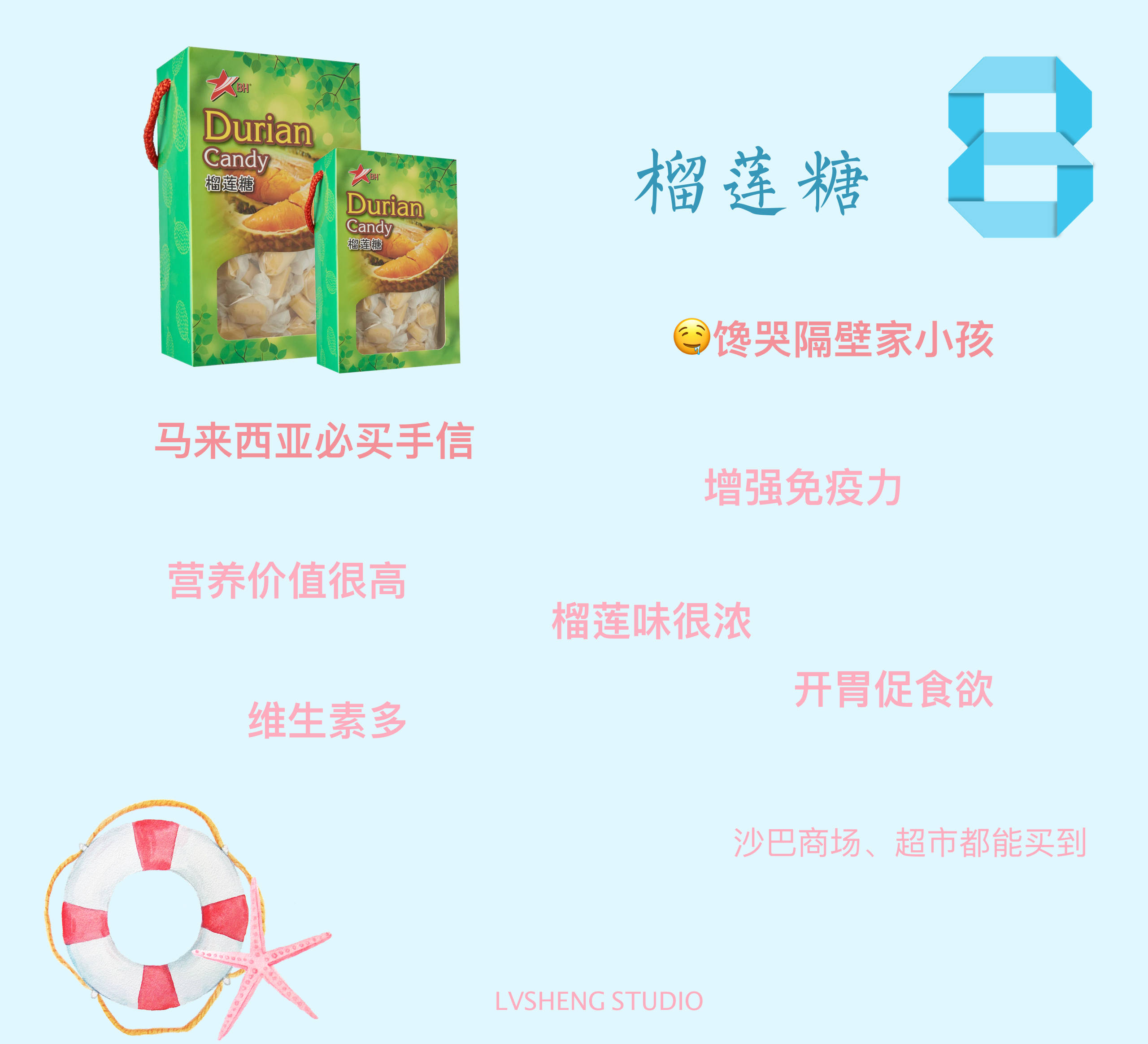 闻着臭,吃起来很香的榴莲糖。而猫山王榴莲糖也是一定要考虑的一款马来西亚特产。榴莲糖营养价值很高,但是吃多了还是很容易上火的。题主可以买一点回去吃吃看。我个人而言还是很喜欢这个糖的。对了,这个糖一般最多吃2颗,吃多了会觉得有一丢丢腻人的感觉。我就推荐这么多了。如果我的回答帮到了题主,希望题主给个“采纳”。祝题主在马来西亚玩得开心。