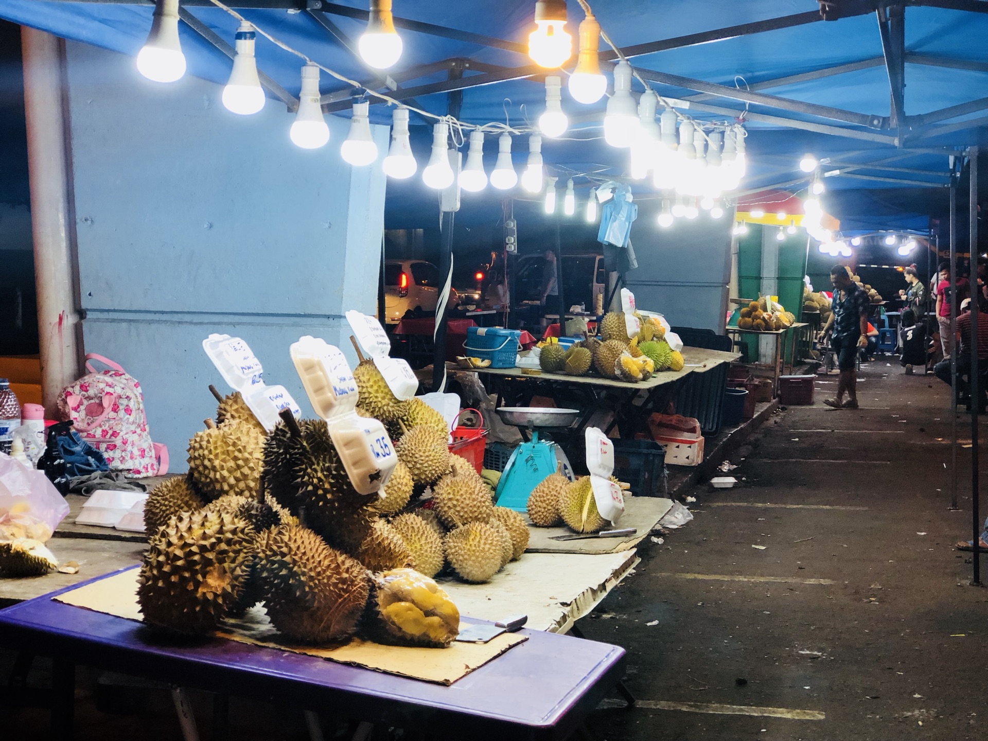 天桥底榴莲水果市场看似风轻云淡,实则暗潮涌动,一经过摊位,卖家开始讲不标准的中文吆喝。最后和彭彭一起选了 果1个、猫山王1个、牛奶榴莲1个,共95rm。付钱时小哥说明天再来,送我一个