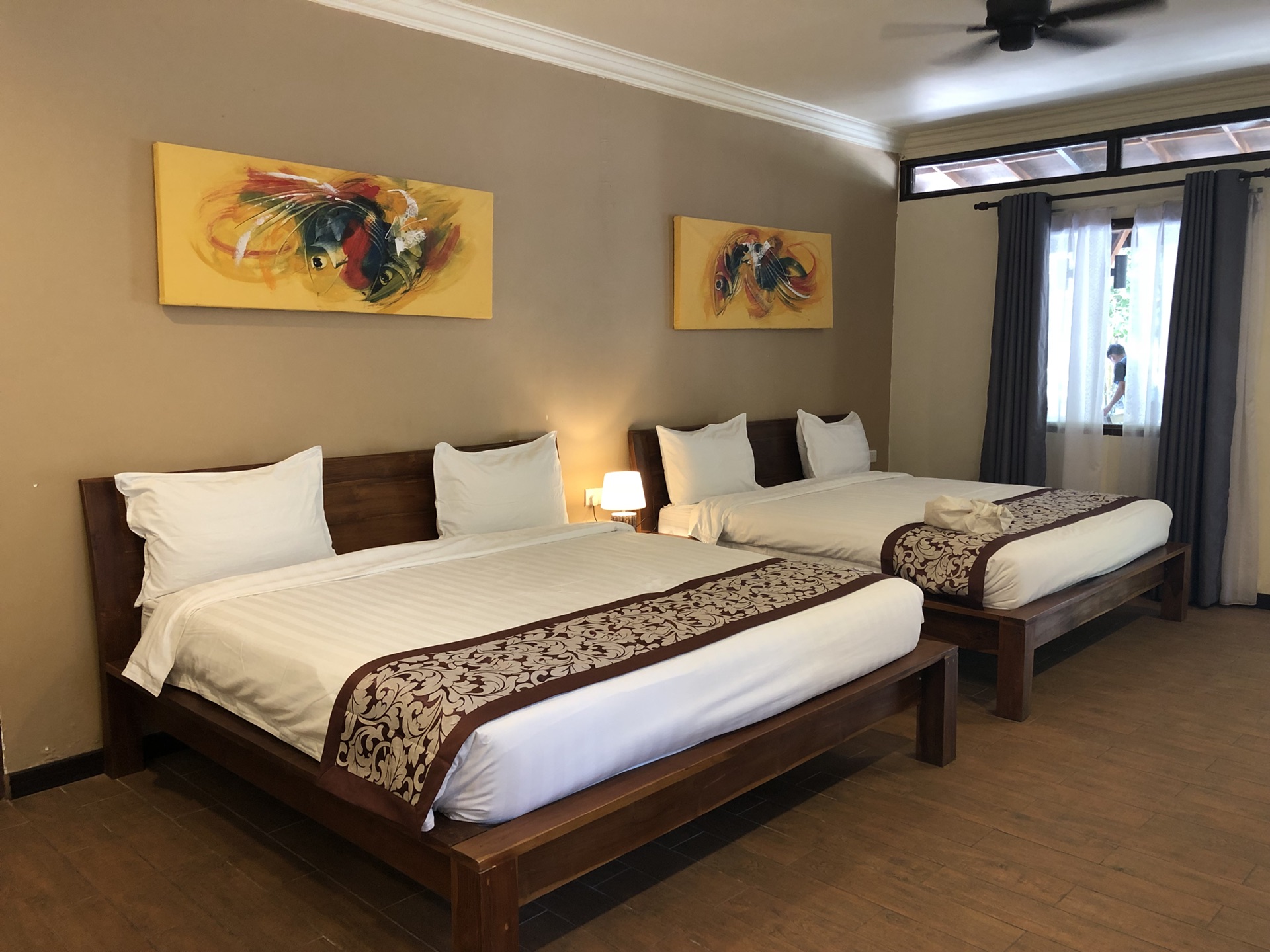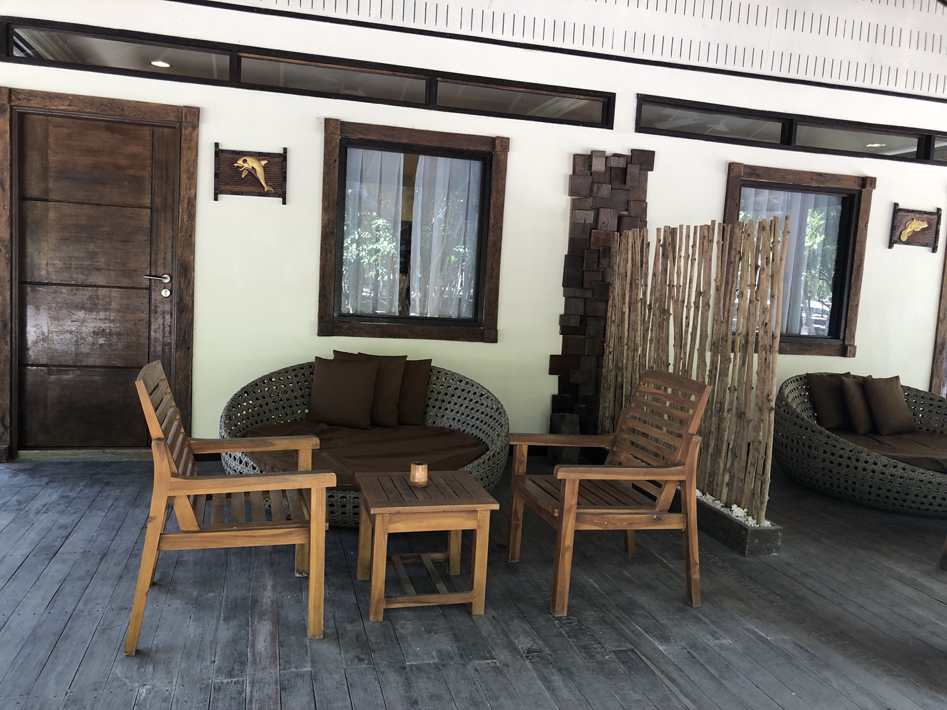 邦邦岛白珍珠度假村我跟彭彭是海豚房,阿雯跟丁丁是斗鱼房。房间中间有扇门,我们是打开的,随时串房。