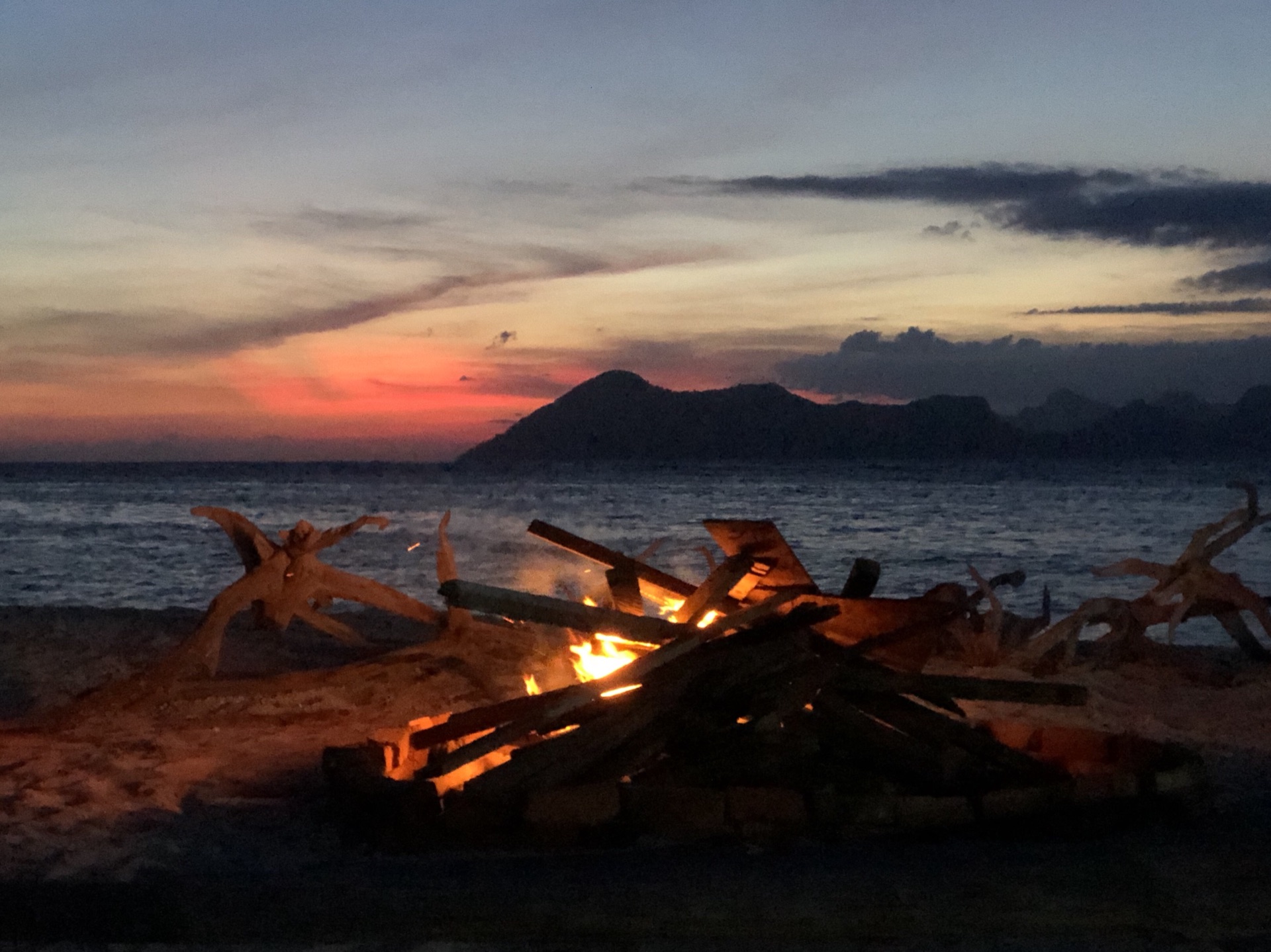 邦邦岛旁边是篝火,还有工作人员弹吉他唱歌,天上星星很亮,海风很柔和,感觉很好~