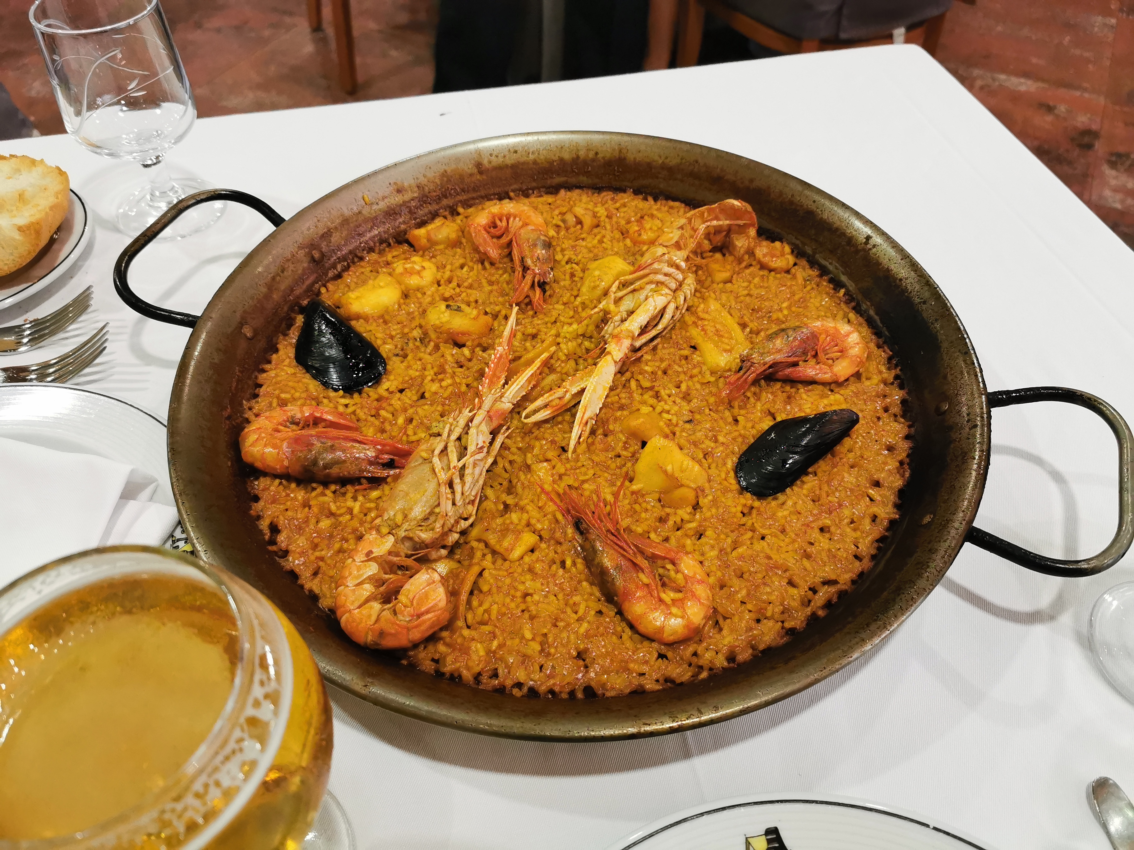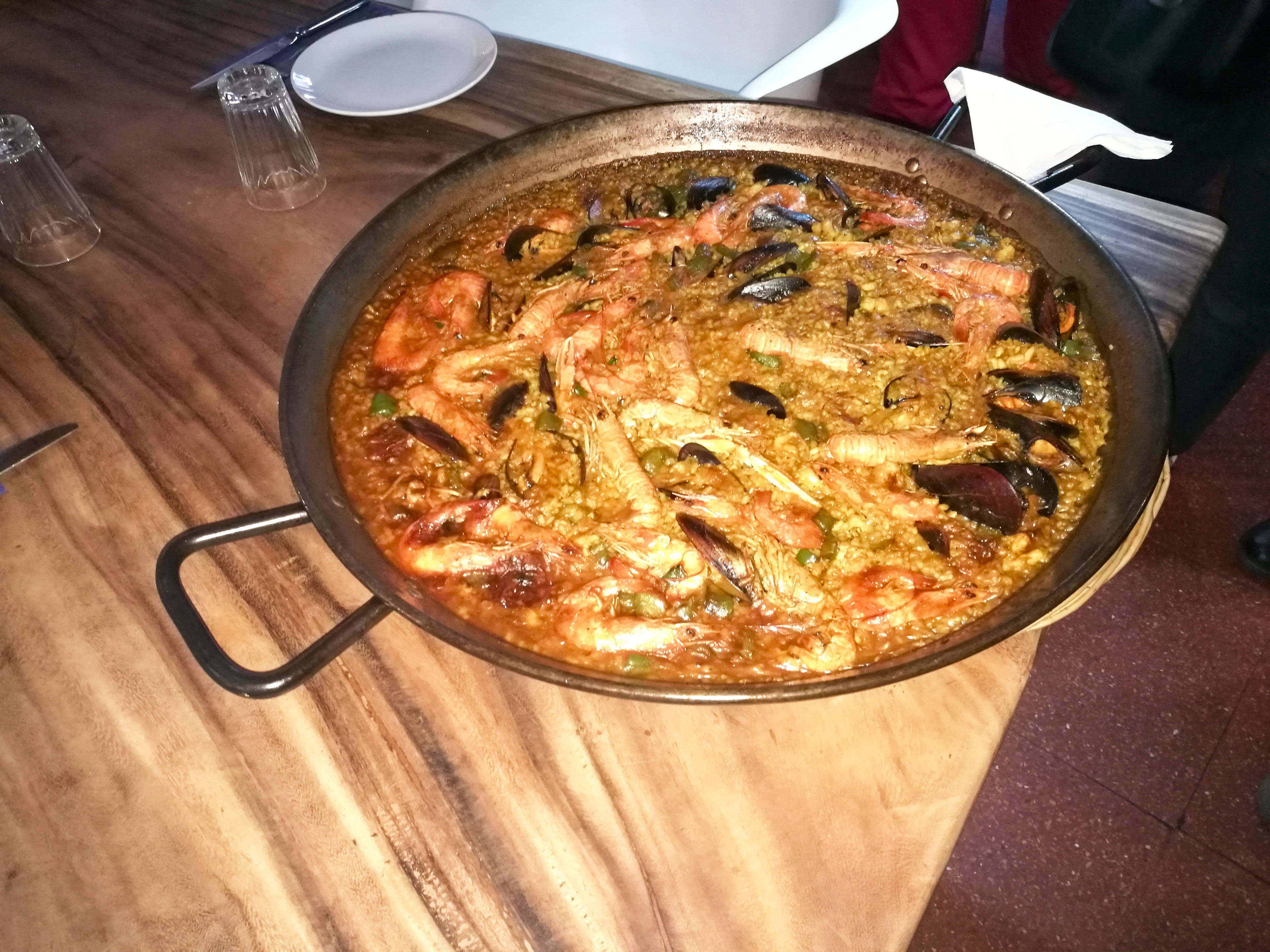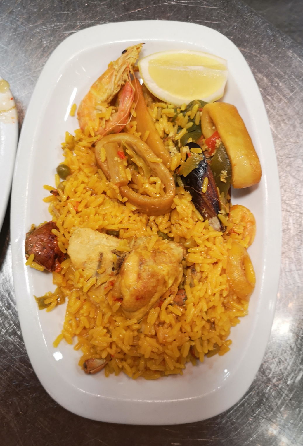 的一道名菜,米饭的橙黄色来自藏红花,其中点缀各种海鲜,虾、贝、鱿鱼,还有西红柿和彩椒,配上