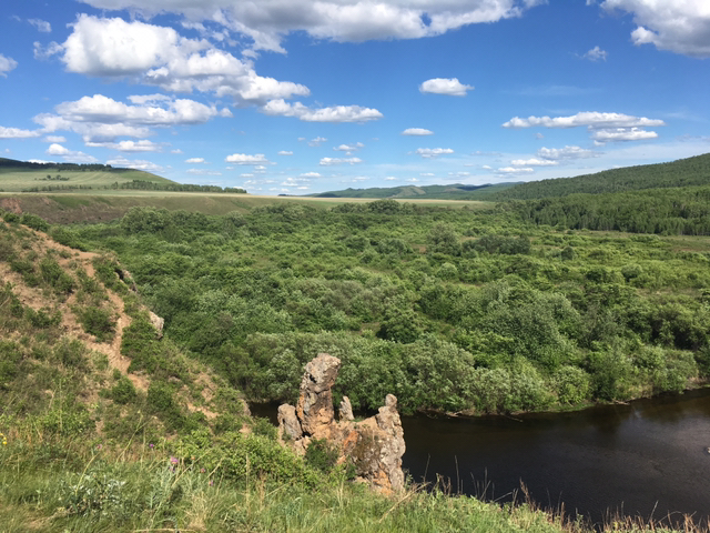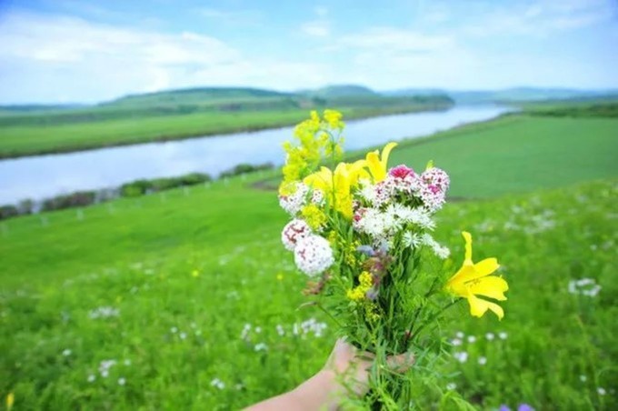 笔直的参天 大树 、蔚蓝的河流、成片的森林、白色的小花、花瓣状的小松果、遍地的野草莓、墨绿色的大山、蓝天白云,这如画一样的美景着实令人迷醉。