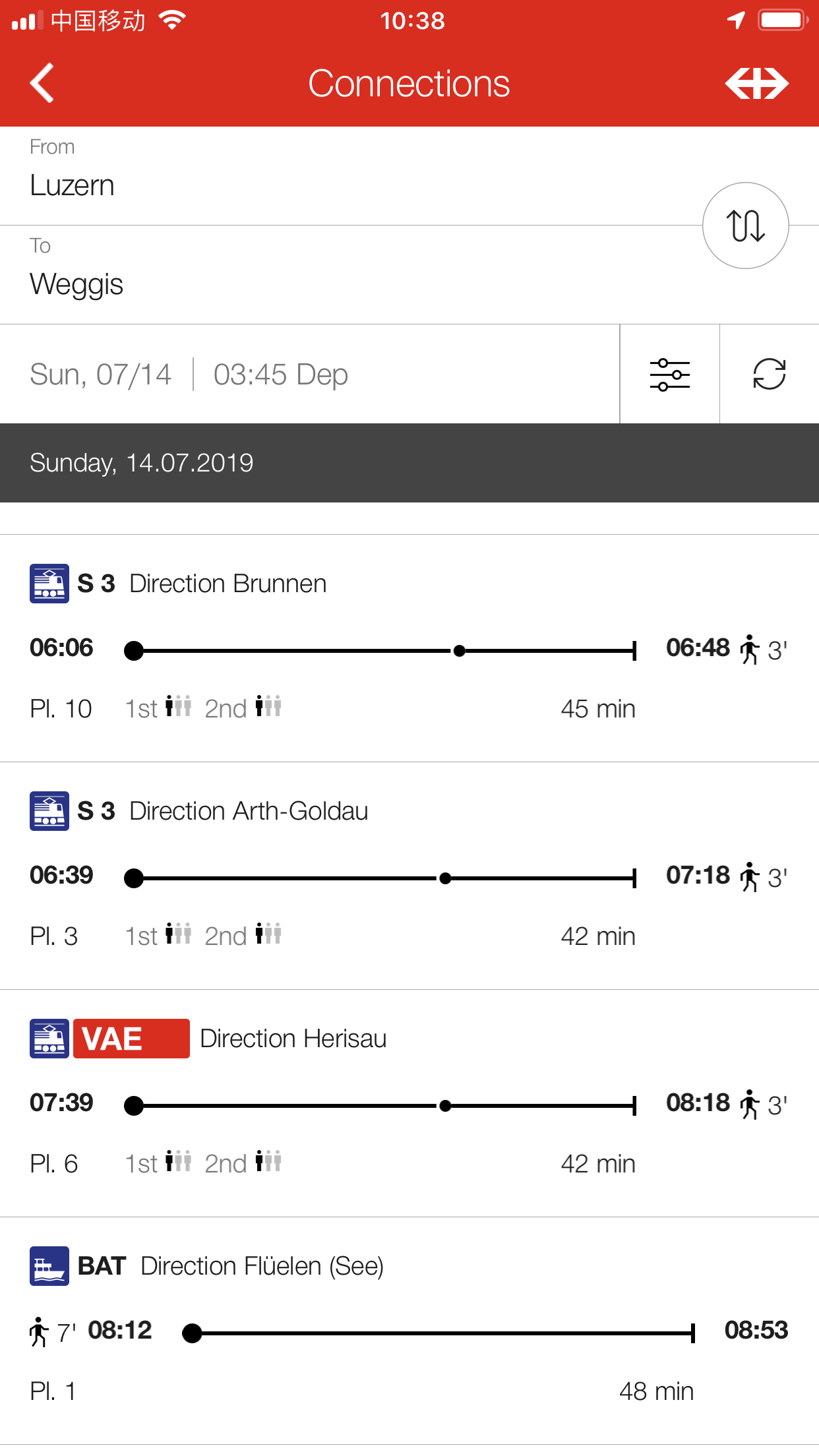 你可以Google或者SBB mobile这个app上面查,很准。========== 如果你觉得TA的回答不错,快来给TA点个赞吧! 你的支持是对作者莫大的鼓励~ 显示全部