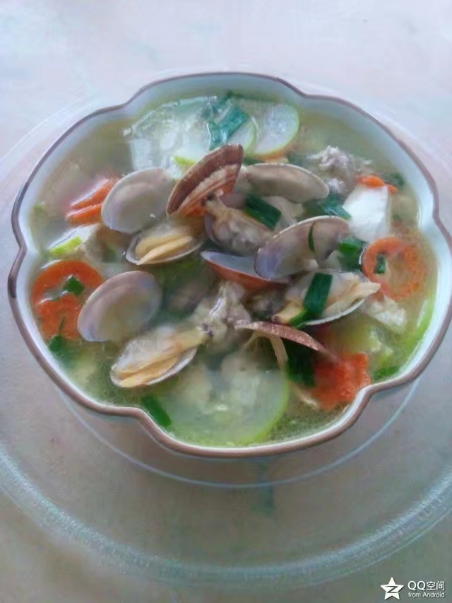蛤蜊节瓜豆腐汤:材料有蛤蜊,节瓜,瘦肉,豆腐,红萝卜,香葱,姜,味道很鲜美,一点味精都不需要!