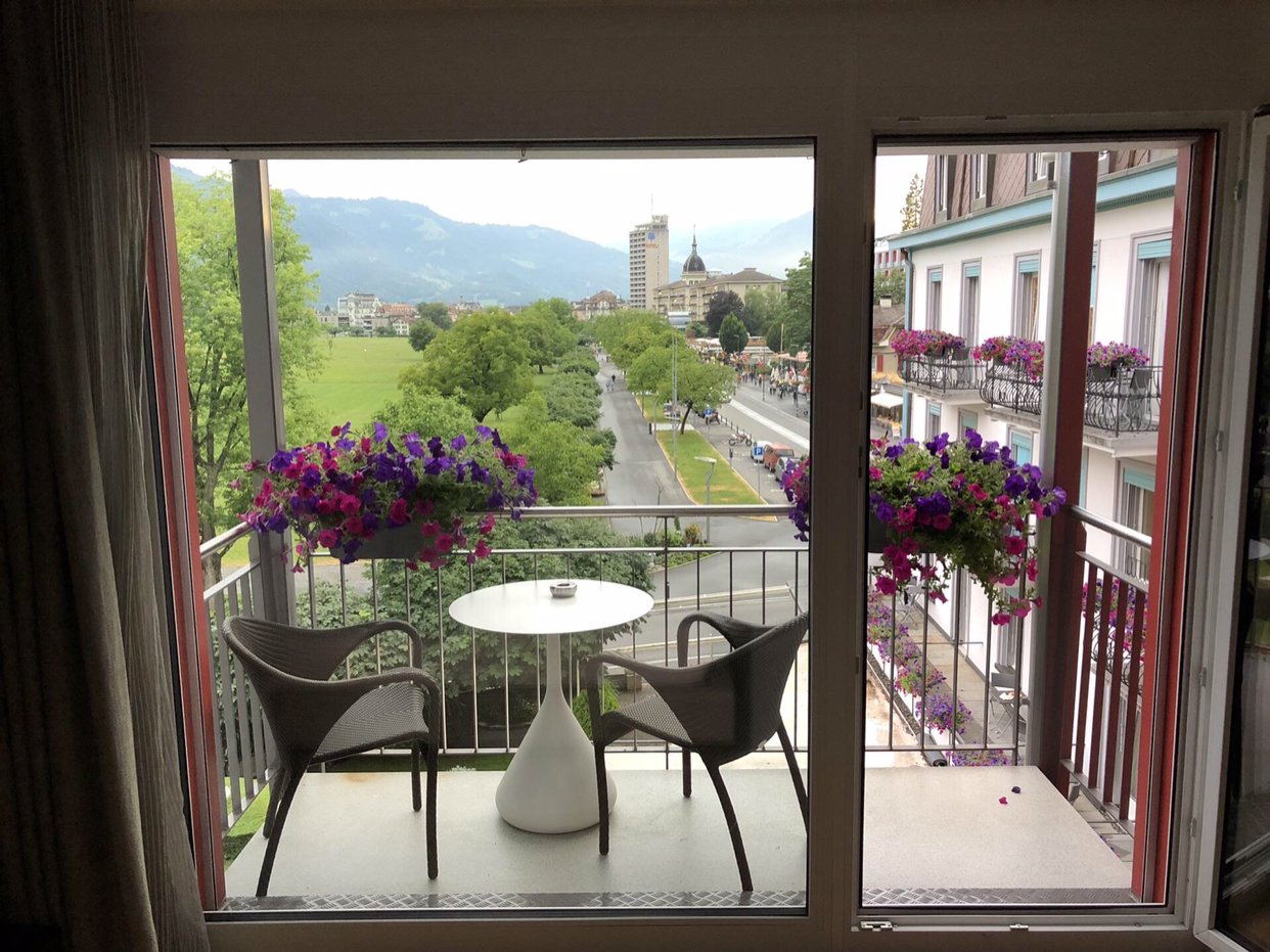 我在因特拉肯住在Hotel Interlaken(因特拉肯酒店),住的他们的小型套房,房间位于酒店的2楼,屋外还有个超级大的露台,光个露台大概就有近10平,露台对面就是个教堂。当时是去年3月去的,应该不算旅游的旺季,差不多1500人民币含税一晚。他家包早餐,走到因特拉肯东火车站大概10分钟。有不少名人入住过这家酒店,比如诗人拜伦,音乐家门德尔松都入住过这家酒店。如果非旺季,他家最便宜的房间差不多1000人民币左右一晚。另外,酒店楼下的餐厅也很不错,服务员也很热心,那天到因特拉肯晚了,懒得去外面找吃的就在酒店楼下吃的。服务员挺热情的,我们点牛肉塔塔的时候,他会和我确认牛肉塔塔是生牛肉,考虑到我们亚洲人确认是否要吃。还会很热情的给我们介绍菜,而且味道还不错。