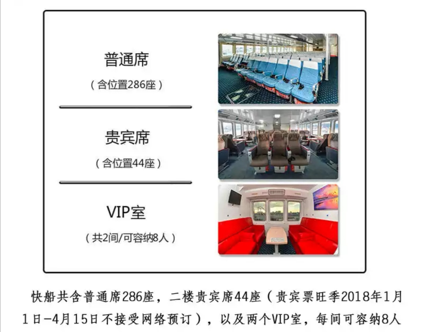 2⃣轮船:2017年初两地轮船通航,选用上下两层的大型双体客轮,较轻的颠簸感,不容易晕船!船舱环境很好,乘坐舒适,航行期间会像飞机上一样有服务员送饮料、酸子糖等。