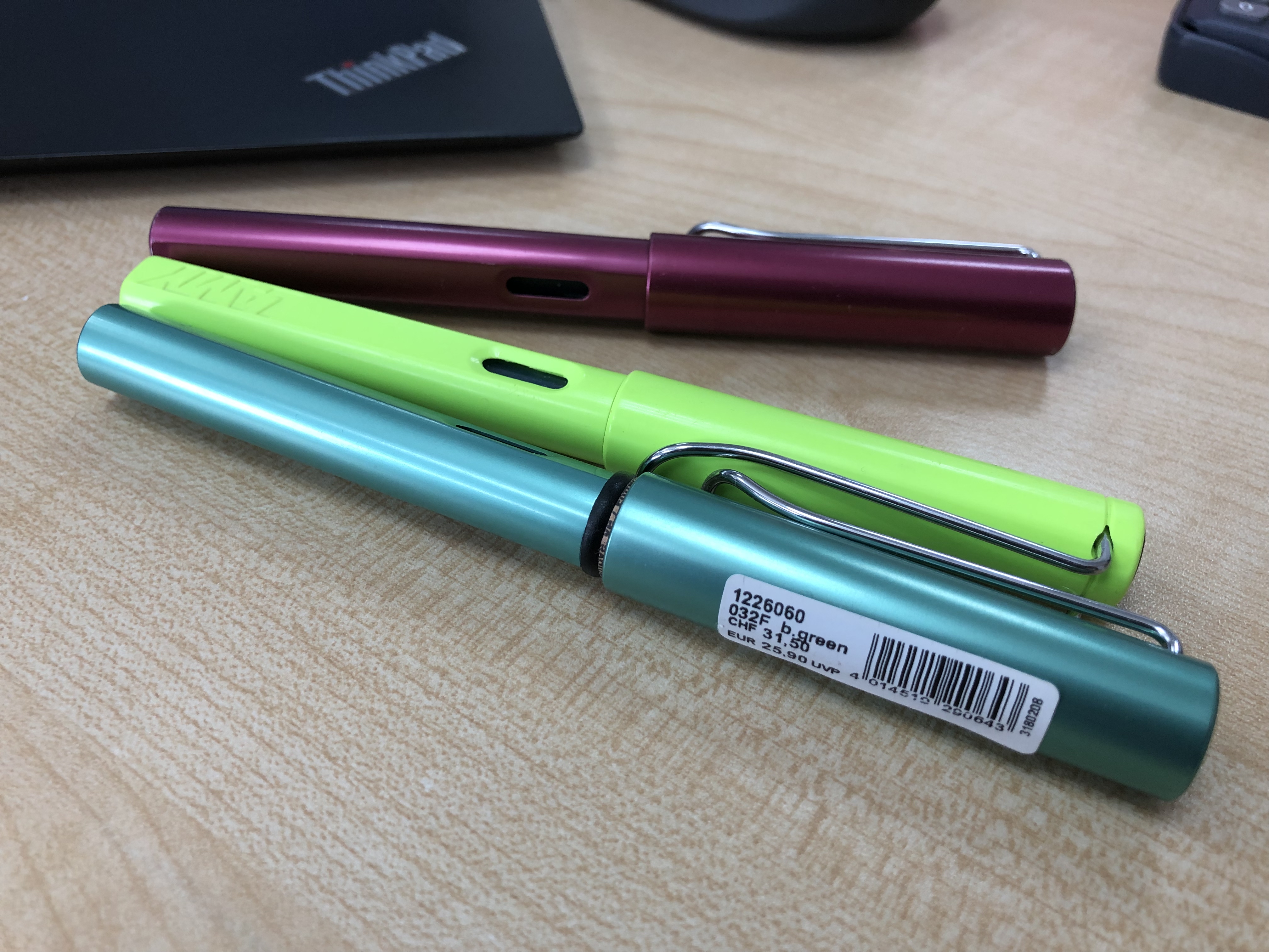 9,Lamy的笔,Safari的钢笔18欧不到一支(国内卖150左右),Al Star的钢笔24欧不到一支(国内卖250左右),这个笔还是非常划算的!国内价格还是网上价格非官方途径,不一定保证正品。我每次去德国或者同事去出差都会让他们帮带一支钢笔或者墨水。至于笔芯,德国5支一盒卖1.99欧(商场价格还算贵的,便宜的1.8欧),国内买35一盒。不过去年我在海德堡买的一支Al Star要25欧超过,当然具体还是要看在哪个城市购买,价格会有差。下面是我身边的3支Lamy。