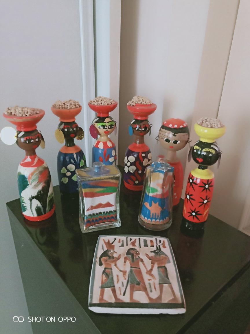 埃及板块:木质小黑人,骆驼,金字塔沙画,石头绘画。