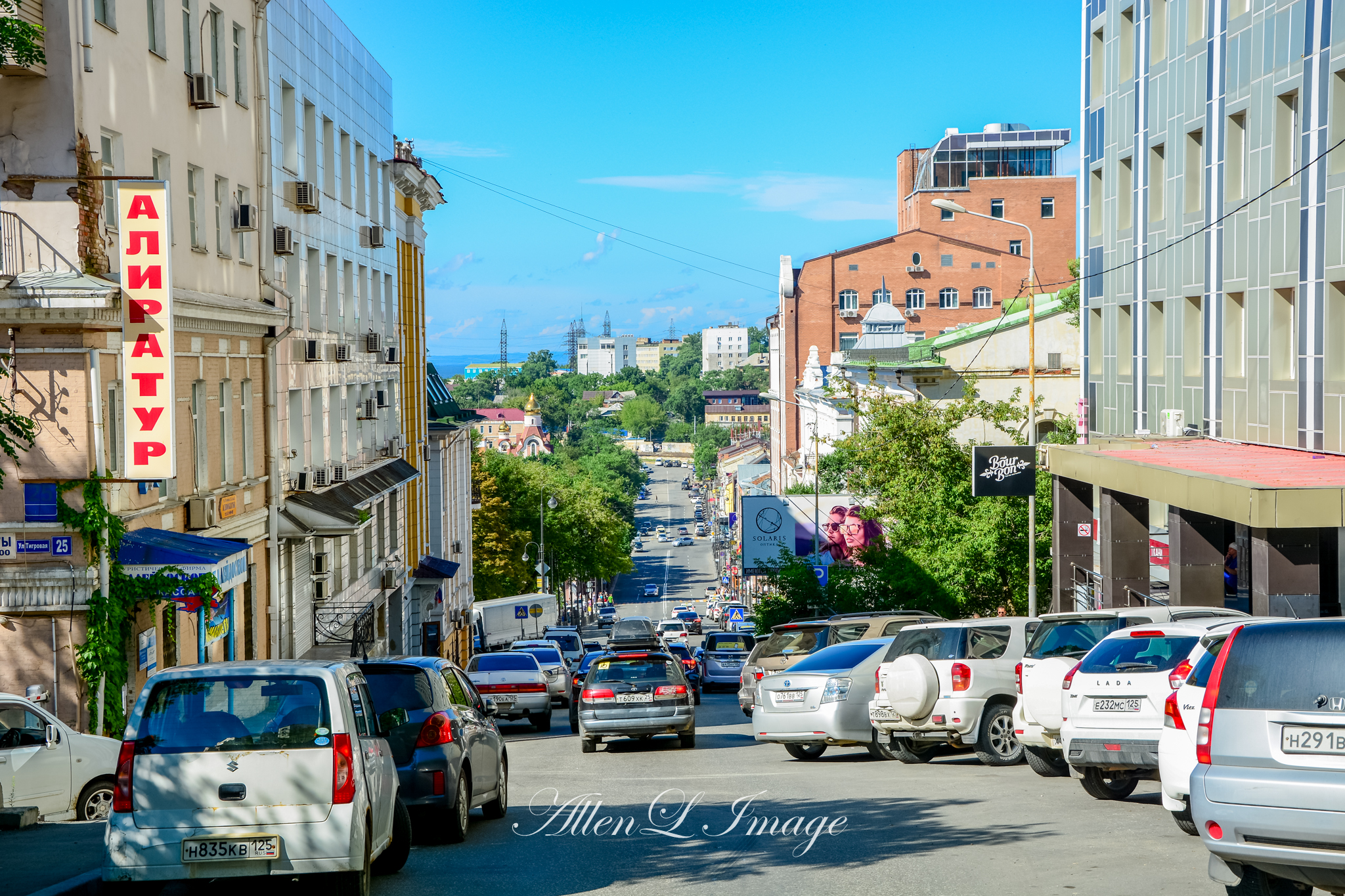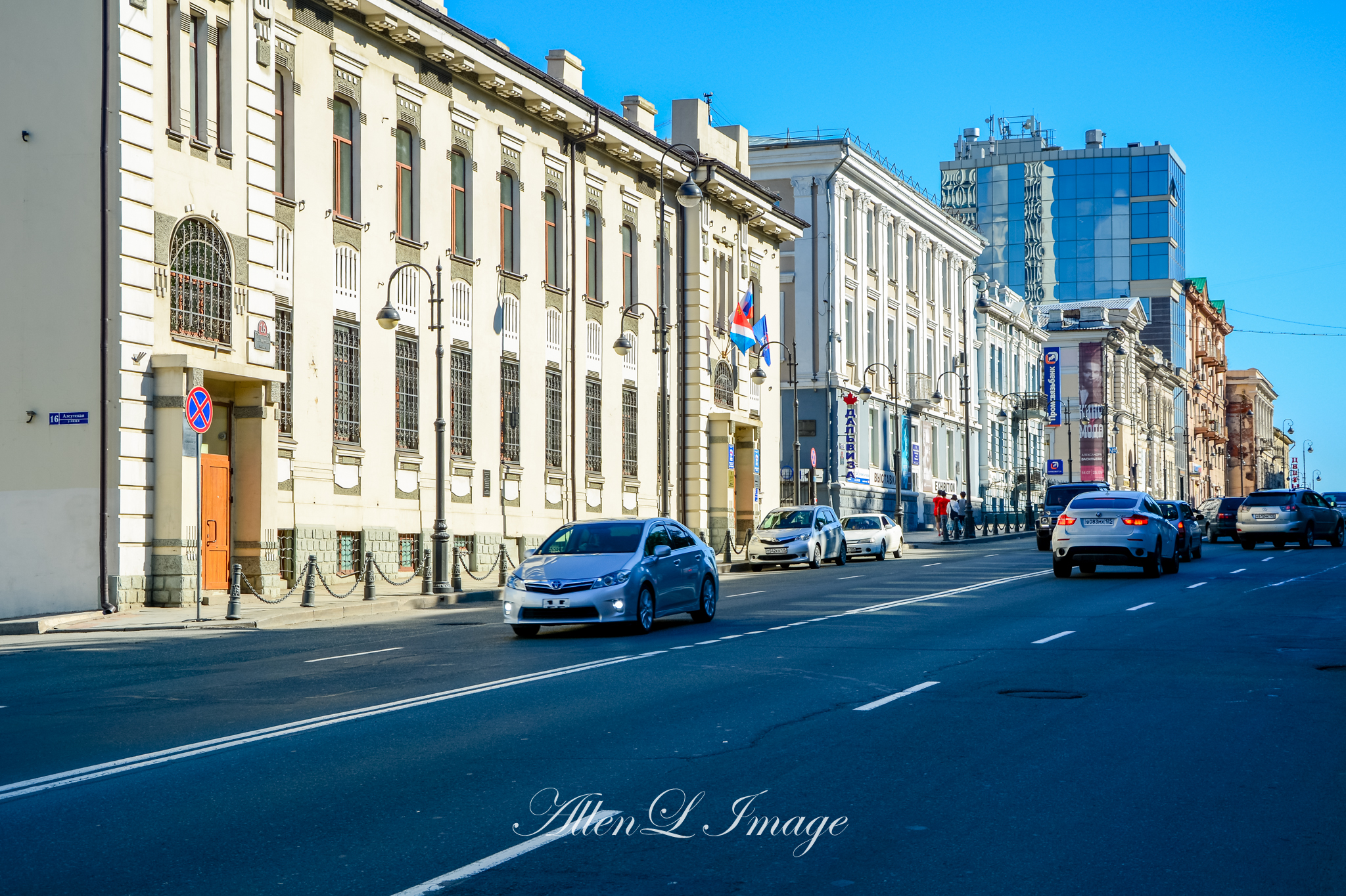 胜利广场附近的大道,就是海参崴著名的斯维特兰斯卡亚大街,市内最为繁华的一条干道,七公里长的大街上排列着风格各异的建筑,众多餐馆和商场林立其中。