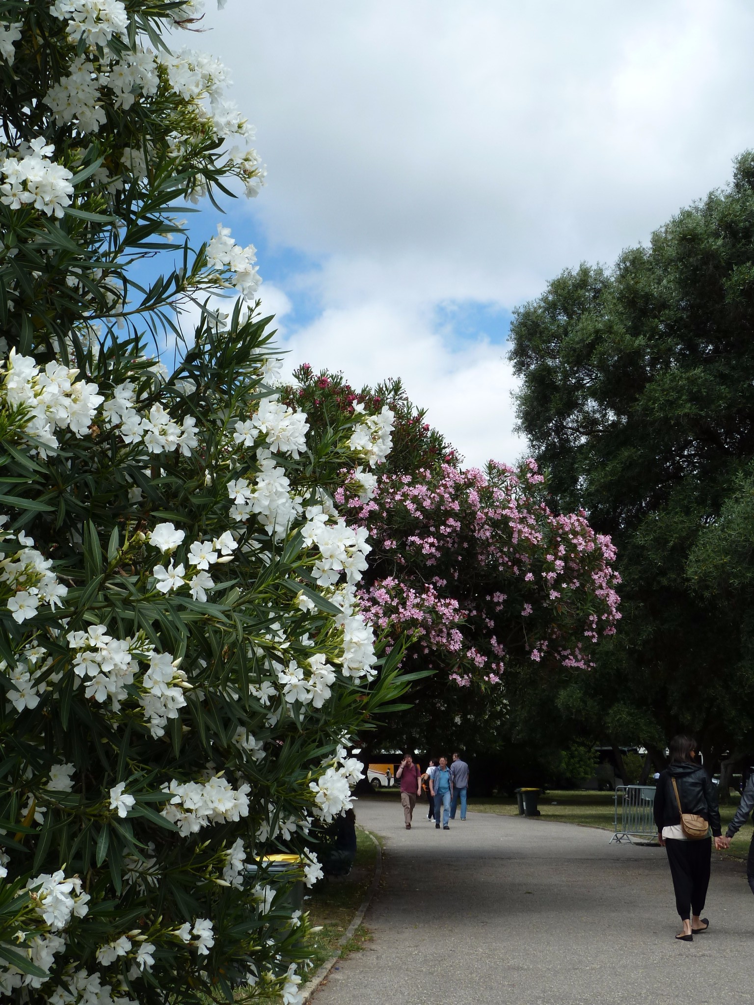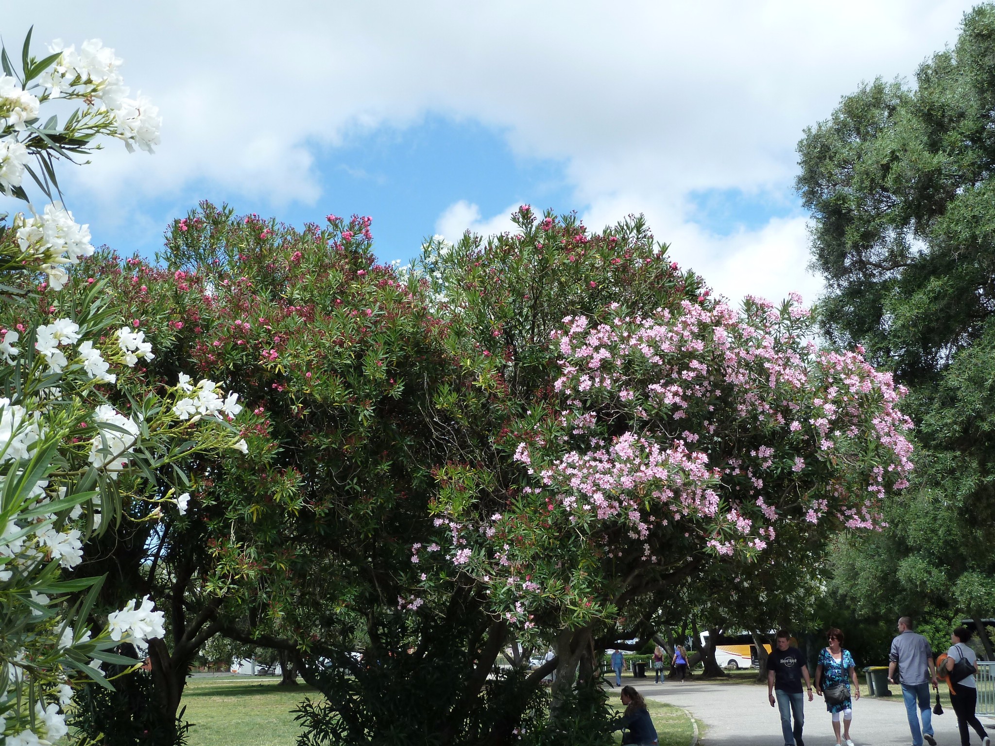 红色 粉色 白色的花树 幽静的林荫小路 晴空万里 心花怒放