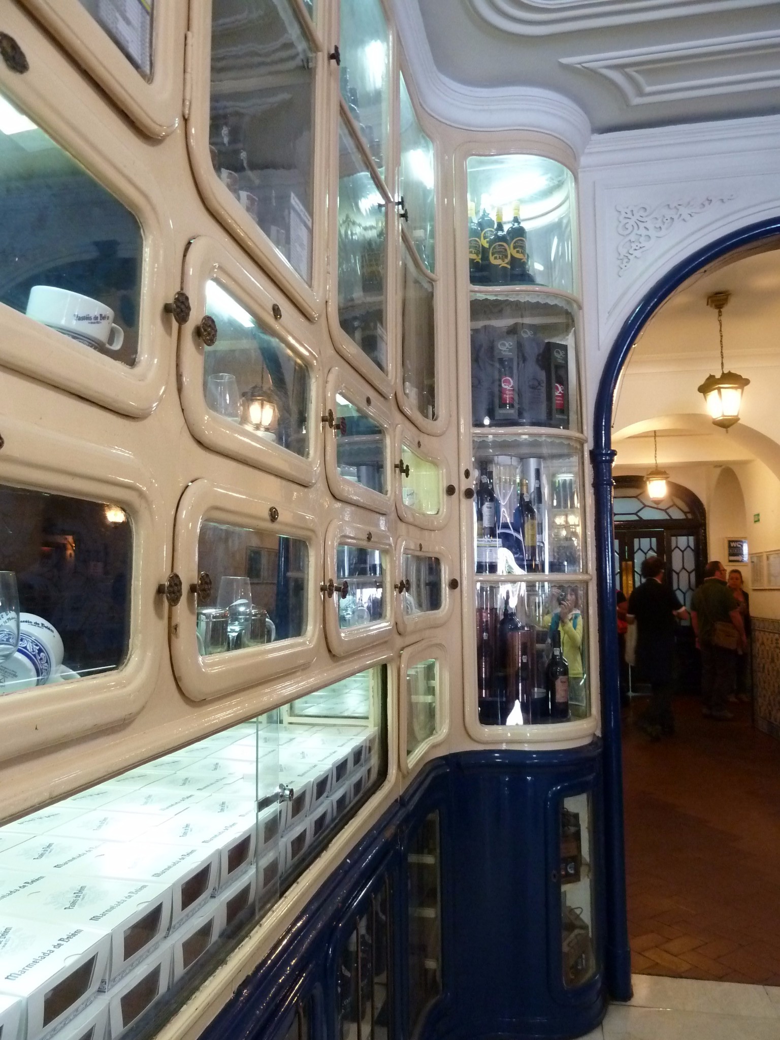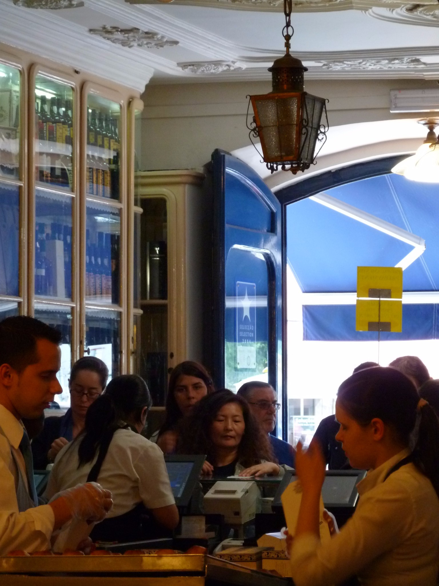 店内优雅大气 圆弧型蓝色门廊 奶油色舷窗展示柜 铜质吊灯 斜拼方砖地板 精致奢华的欧式装修风格 不像是个蛋挞店,到像是高雅的上流社会PARTY俱乐部