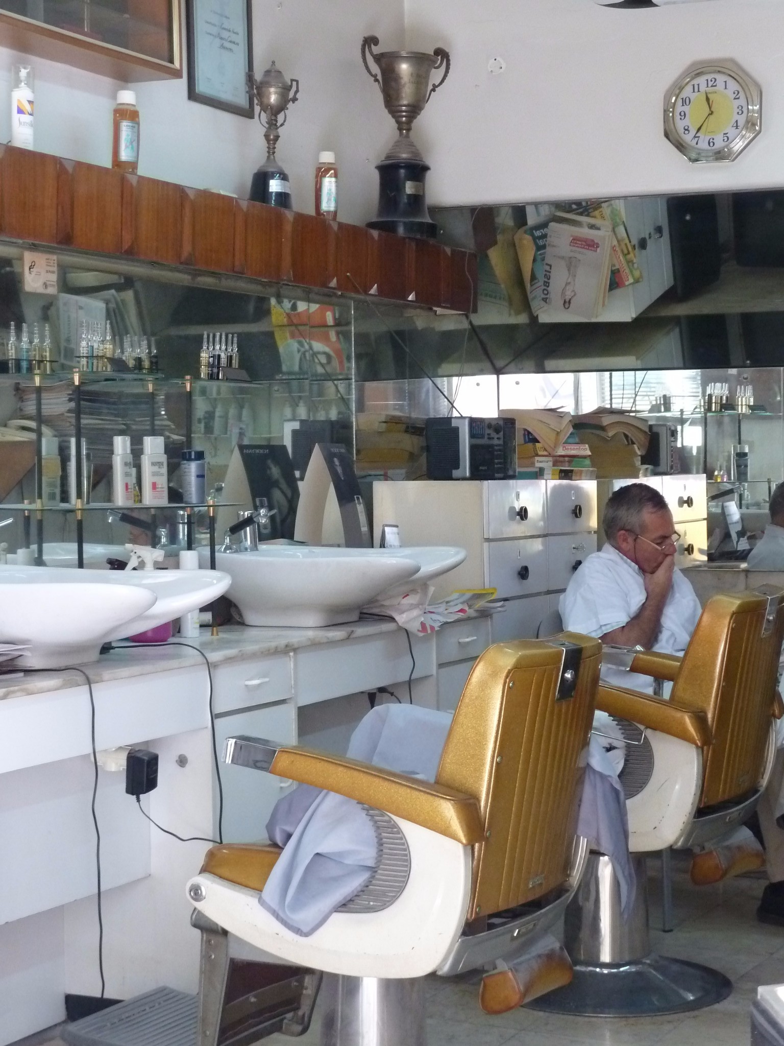 古朴的理发店 老式的升降理发椅 芜杂的洗发液 老师傅正闲坐看报
