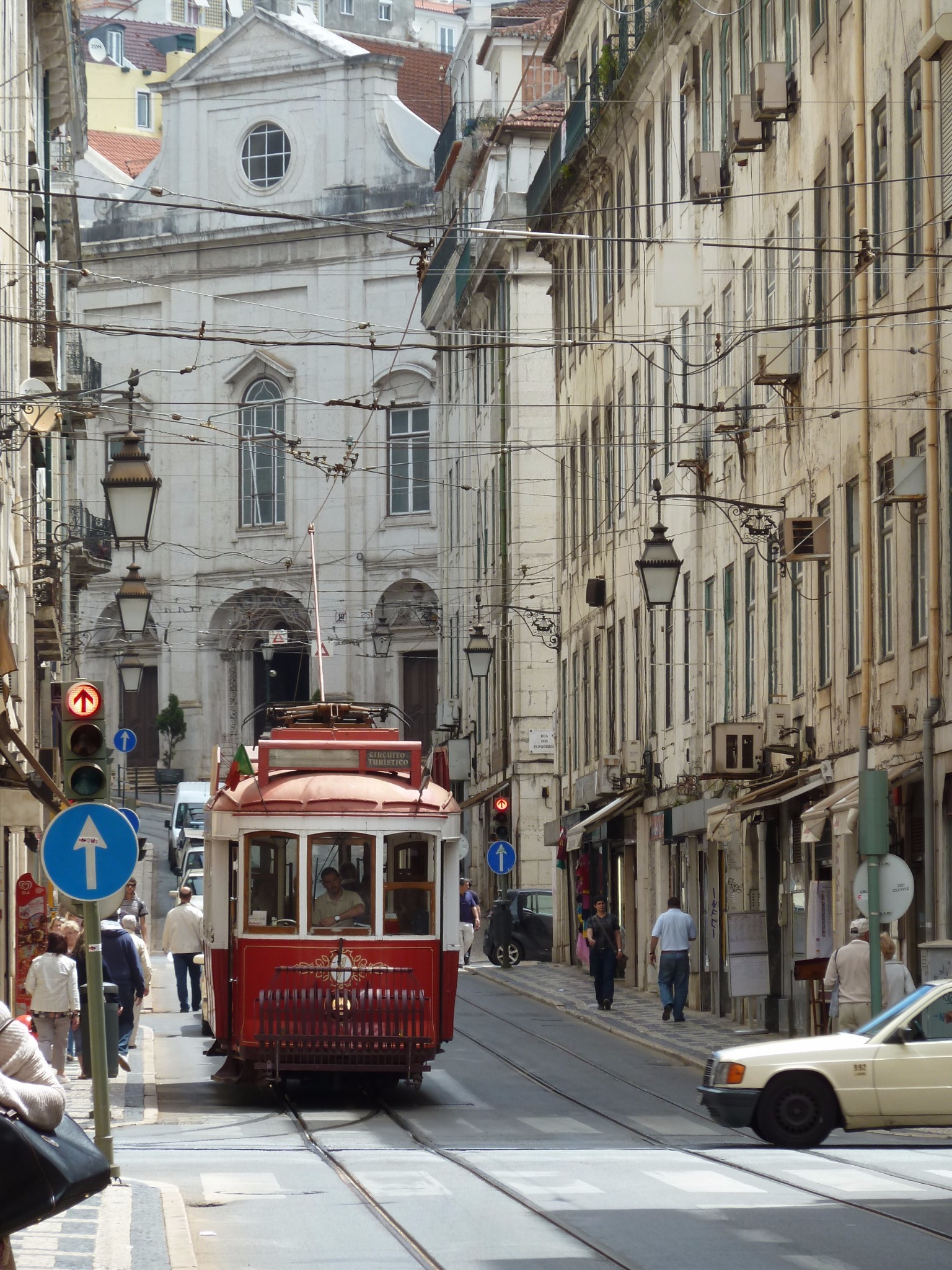 红色的电车叮叮当当地驶过狭窄的街道 古老的街灯悬在窗口上 老奔驰横冲而过