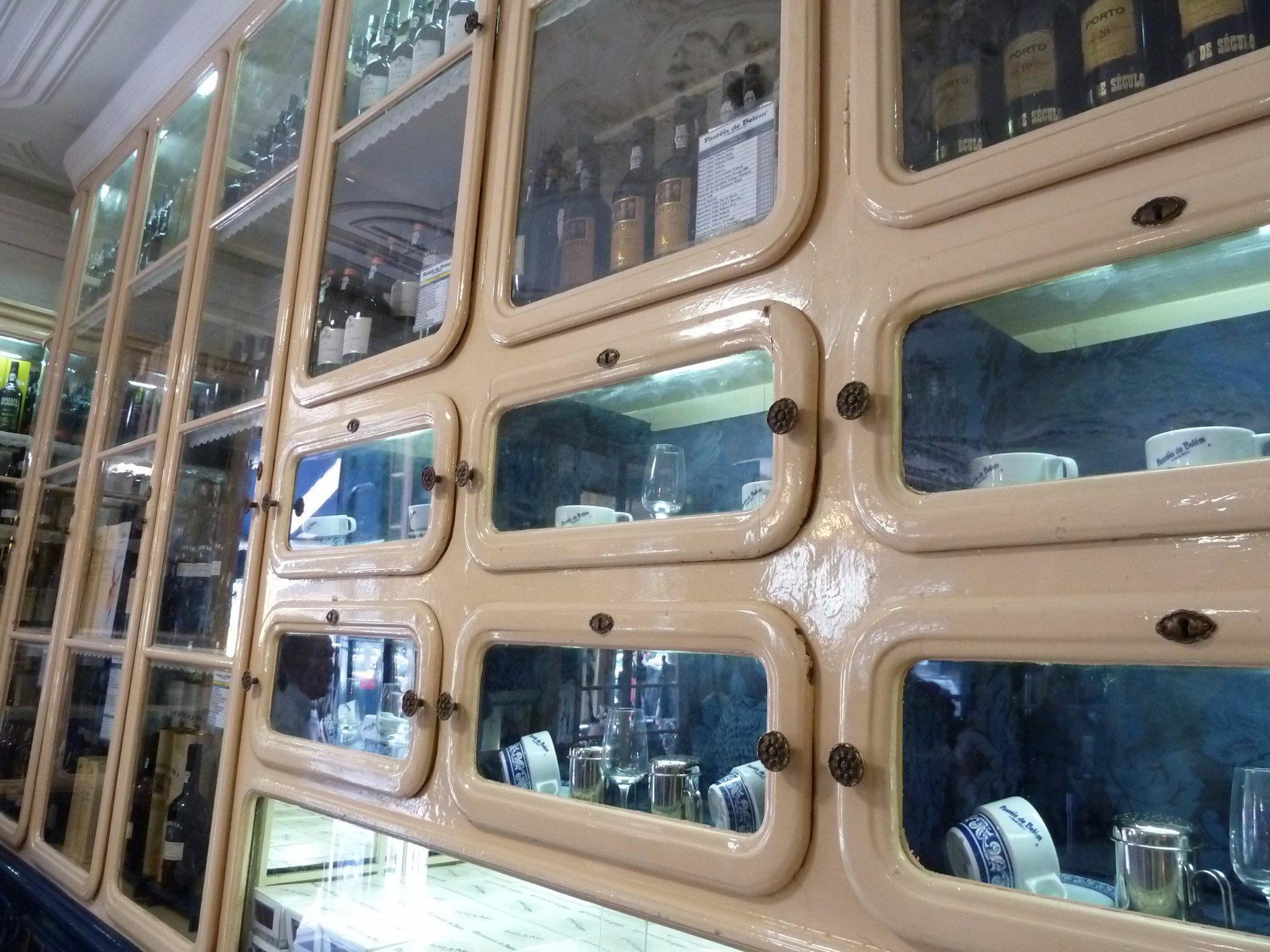 船舷展示窗里 描金的瓷器 玻璃酒杯 一瓶瓶的葡萄美酒 精致 奢华 异彩缤纷