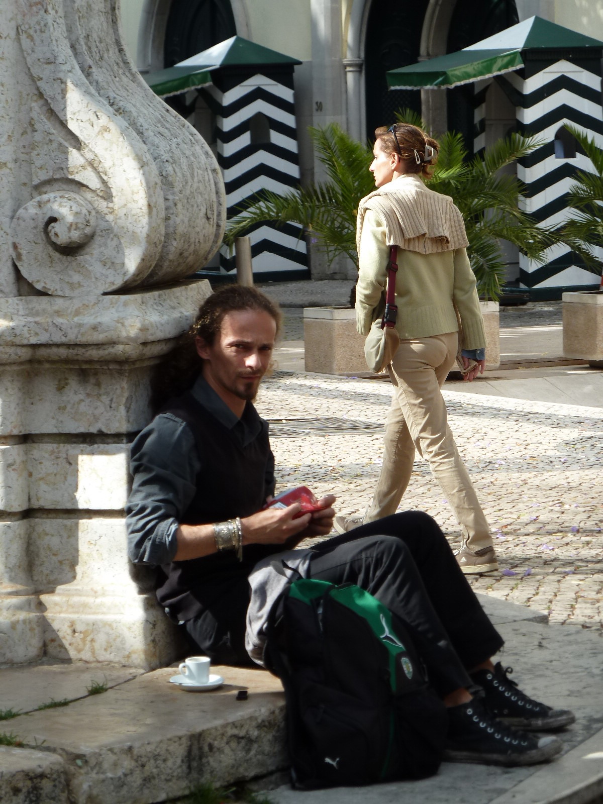 石阶上闲坐的嬉皮帅哥 一小杯Espresso黑咖啡 一个背囊 一头卷发