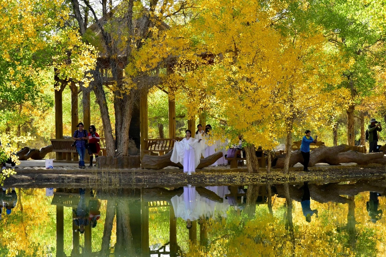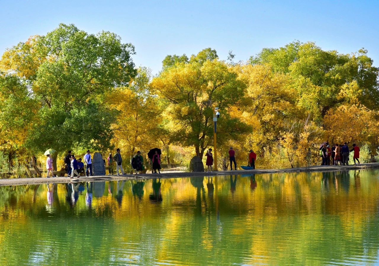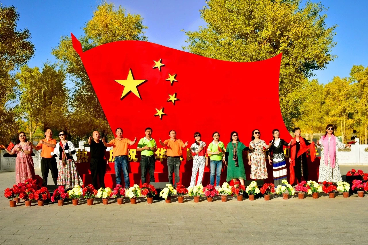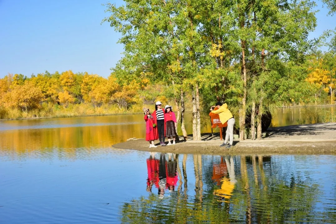 这里是大漠深处的风情画,秋色彰显着金黄的温馨和华贵,纯净靓丽的湖中倒影美得让人不忍触碰,像一面镜子,倒映着蓝天白云和湖边的秋色,如梦如幻,令人流连忘返,各地游客被如画般的美景陶醉,声情并茂的演唱这《我和我的祖国》。