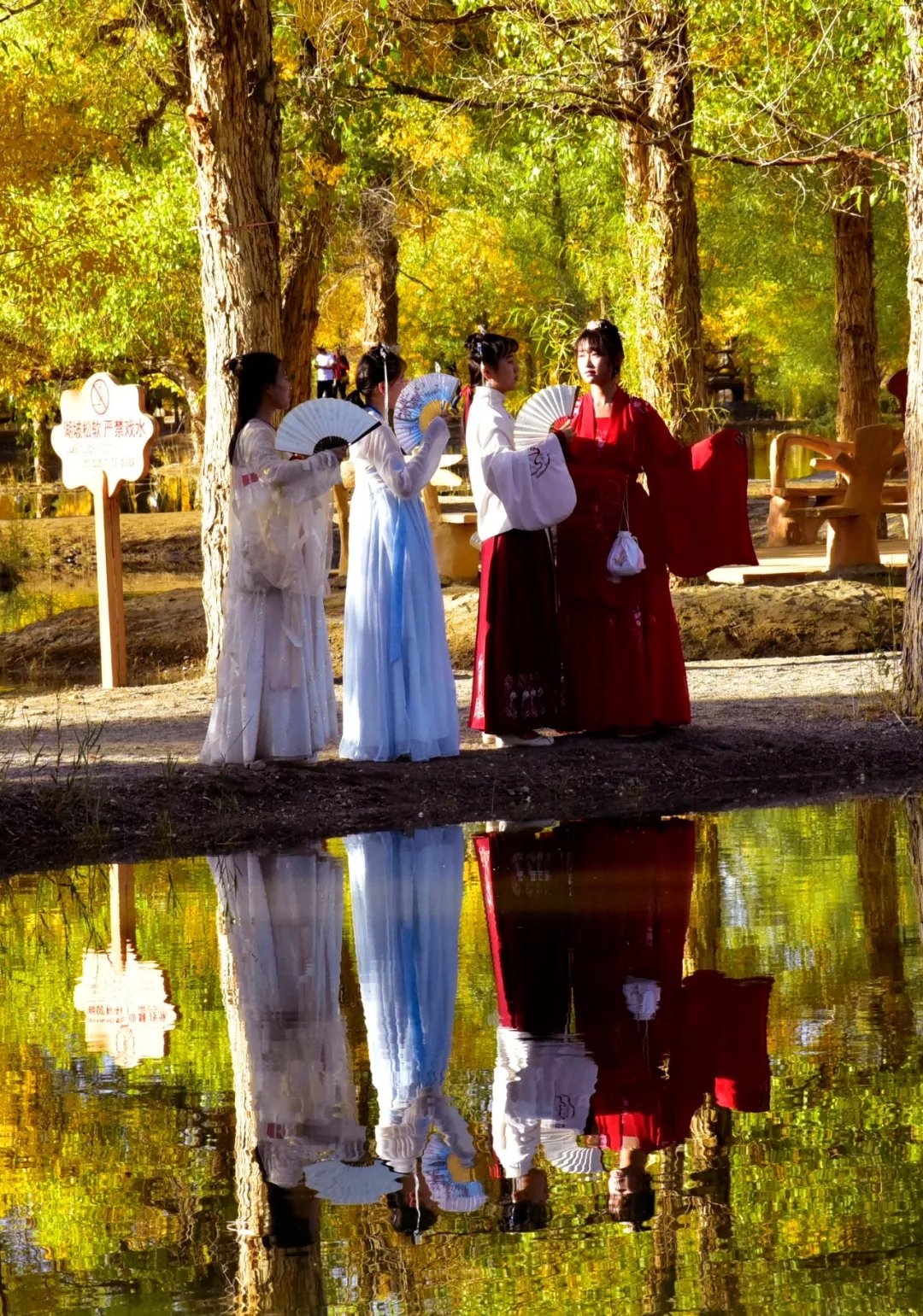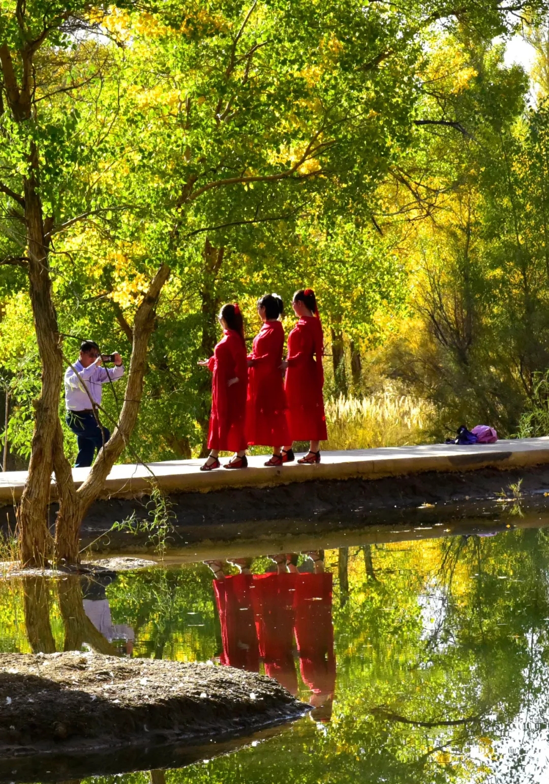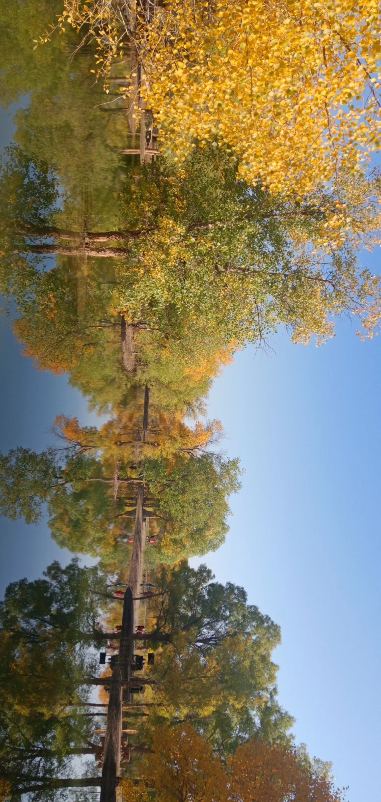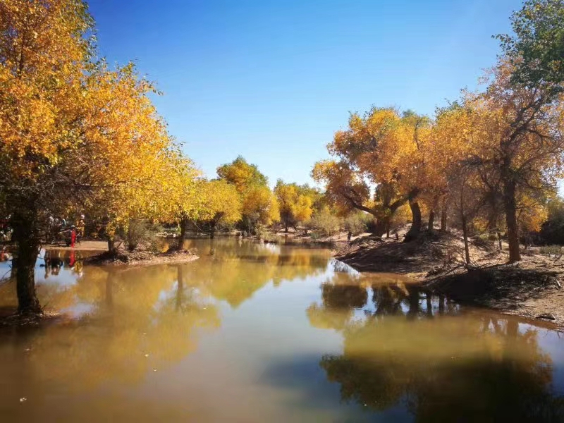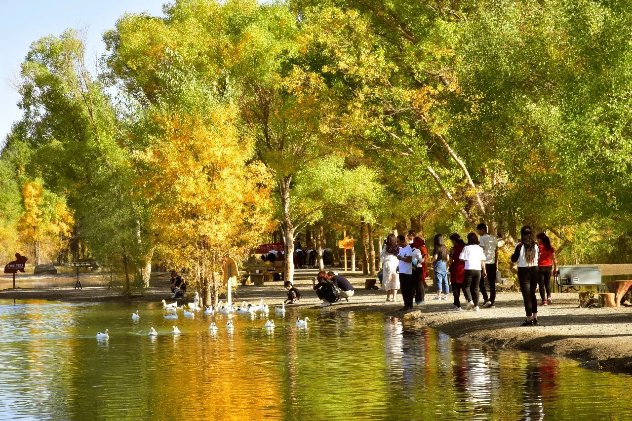 这里是大漠深处的风情画,秋色彰显着金黄的温馨和华贵,纯净靓丽的湖中倒影美得让人不忍触碰,像一面镜子,倒映着蓝天白云和湖边的秋色,如梦如幻,令人流连忘返,各地游客被如画般的美景陶醉,声情并茂的演唱这《我和我的祖国》。