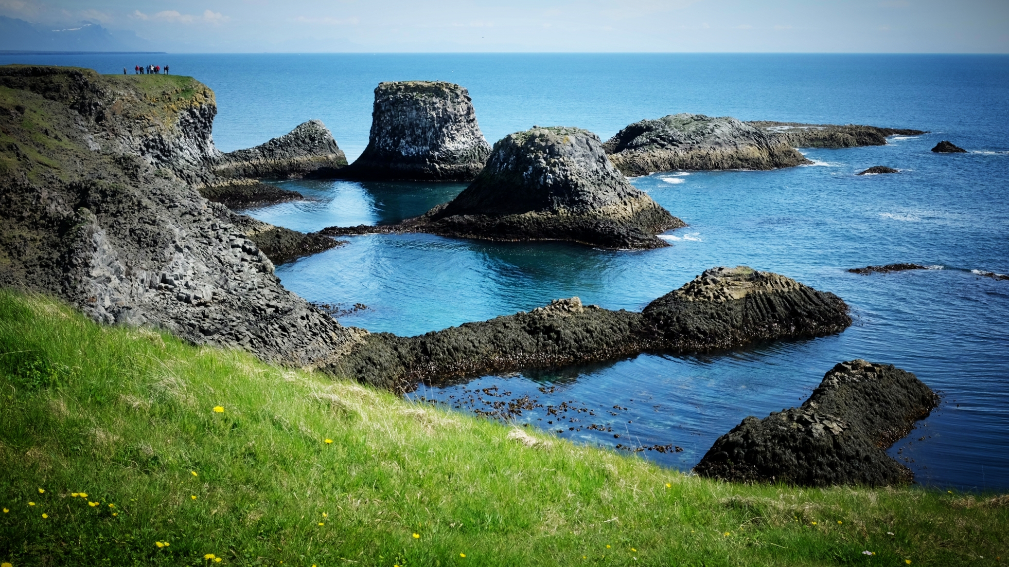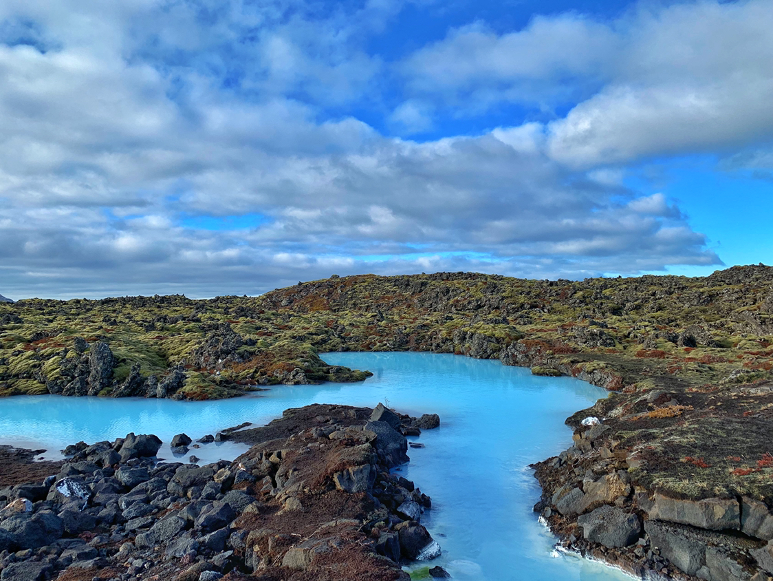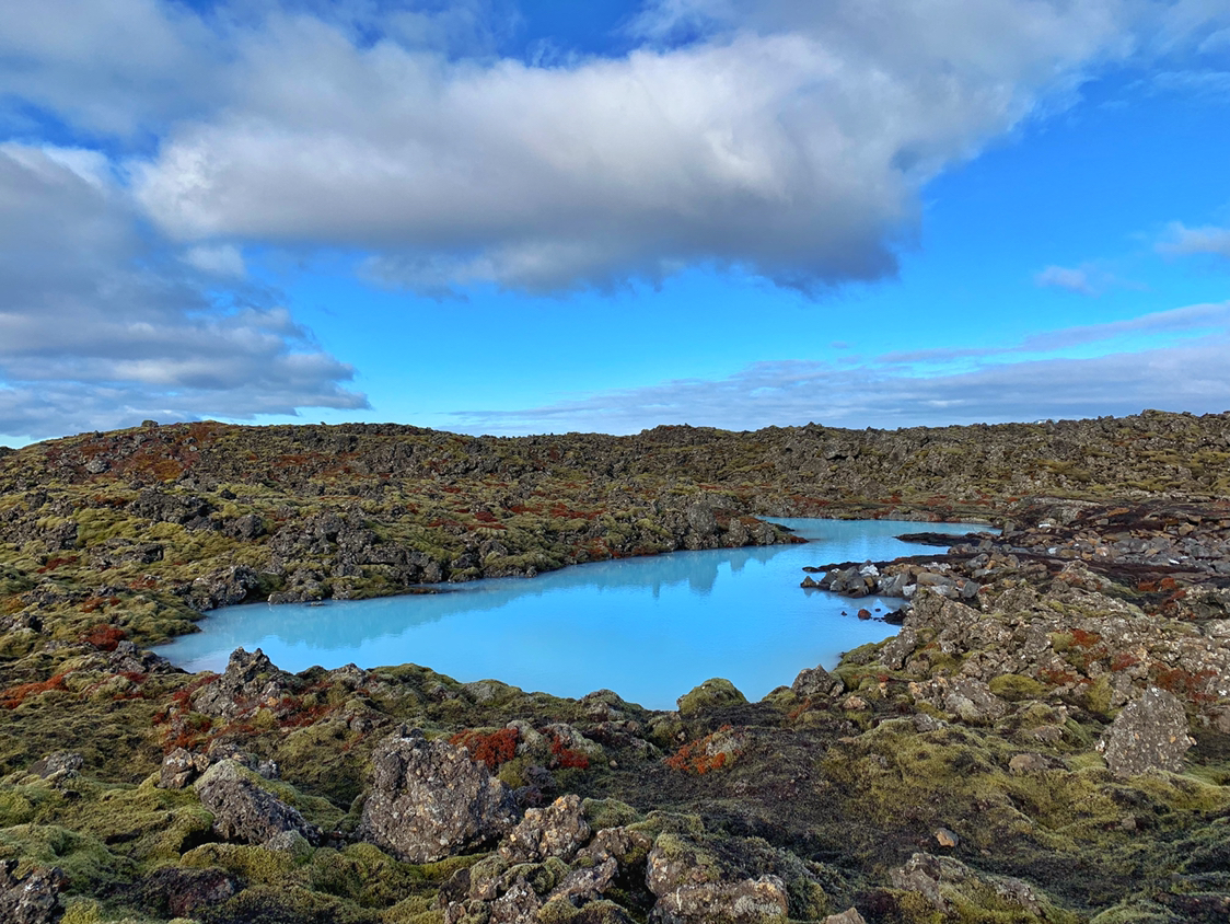 的象征,必去的五星级景点。蓝湖的水是奶白色的,含多种矿物质的温泉水,经地热工厂降温,从100多度变成人能够承受的38度。好多大巴拉来很多的游客,算是这两天看到的最集中的人流了。排队买票的时候天变晴了,蓝天映着奶白色的湖水泛出淡淡的蓝色,多孔洞的火山石遍布湖边,天外仙境的感觉。换上比基尼冒着寒气奔向湖水,啊,好暖和啊!