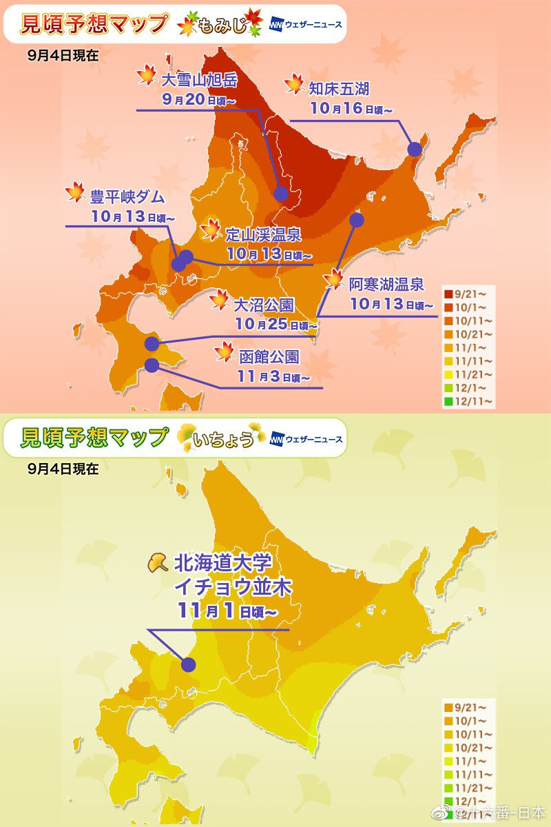 同样北海道,通常道央比道南早一个月不止。一是纬度差异,再就是海拔和地形差异。这是三周前气象局发布的内容,望题主参考。========== 如果你觉得TA的回答不错,快来给TA点个赞吧! 你的支持是对作者莫大的鼓励~显示全部
