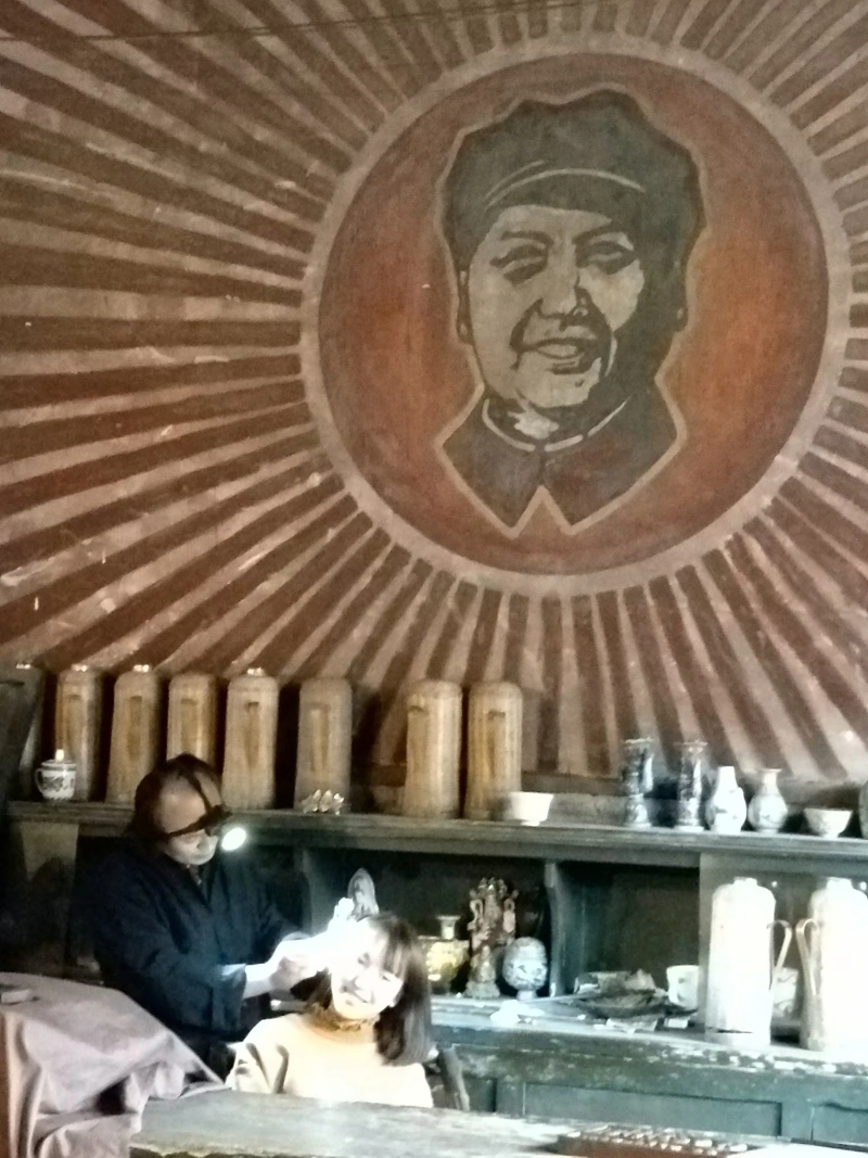 成都老茶馆里,技师给女孩掏耳朵,背景还是文革时期的像。