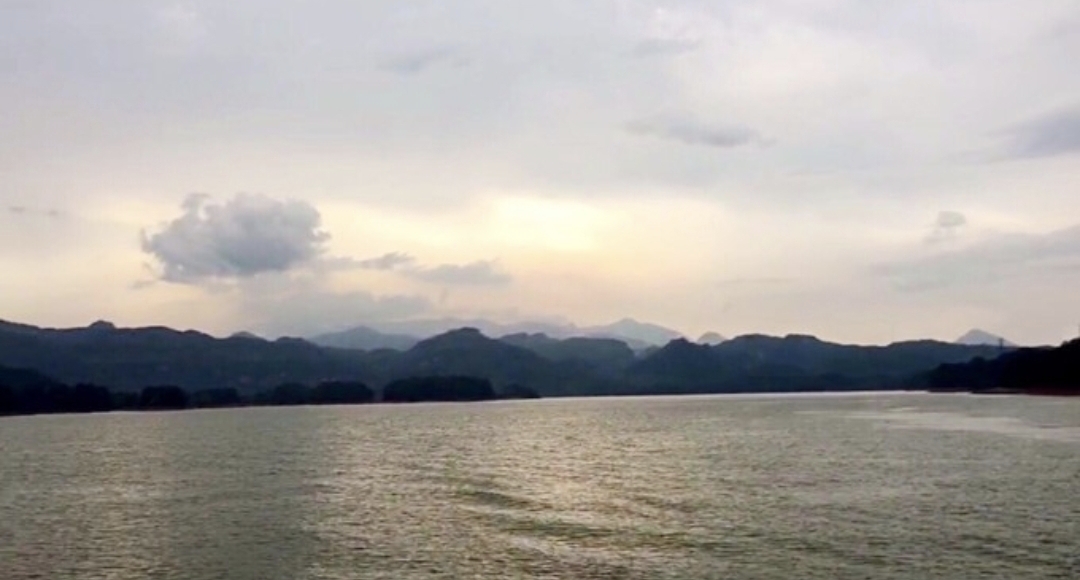 游览水上丹霞大金湖:这一天刚上船就下起了大雨,天很快就烟雨蒙蒙了,没多久雨又停了,天的尽头竟然出现了一片美丽的晚霞,整个大金湖被美丽的霞光普照着,所有的游客走出船舱拿起手机拍摄着这美丽的自然景观!