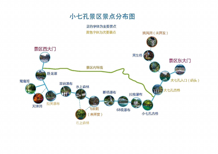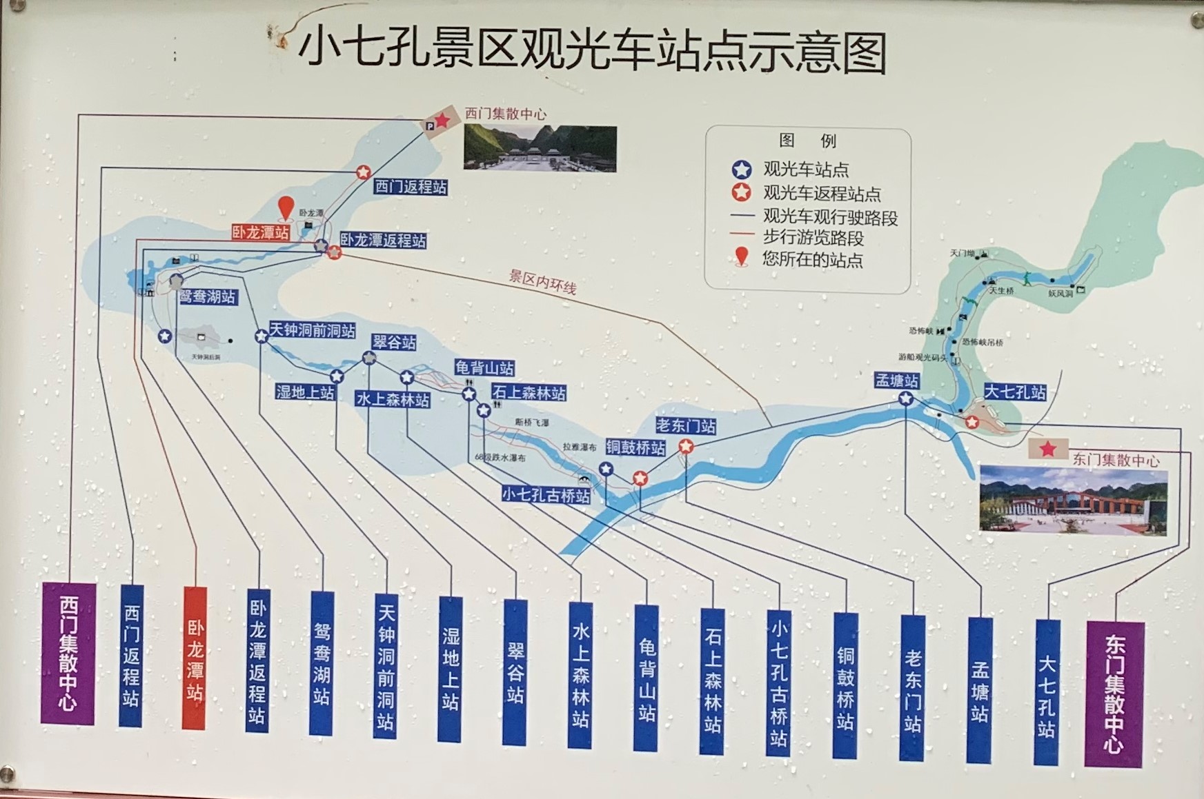 [题主采纳]题主你好,我们上个月刚从贵州玩好回来,先贴一张小七孔景区观光车的运行示意图:首先,游玩小七孔景区必须要乘坐观光车,因为里面太大,靠步行根本没法走,当然部分景点之间可能可以靠步行。我们当时是从西门进的,从西门先坐到第一个景点卧龙潭,然后下车步行游览,游览卧龙潭完毕后到乘车点上车去鸳鸯湖或者翠谷瀑...显示全部