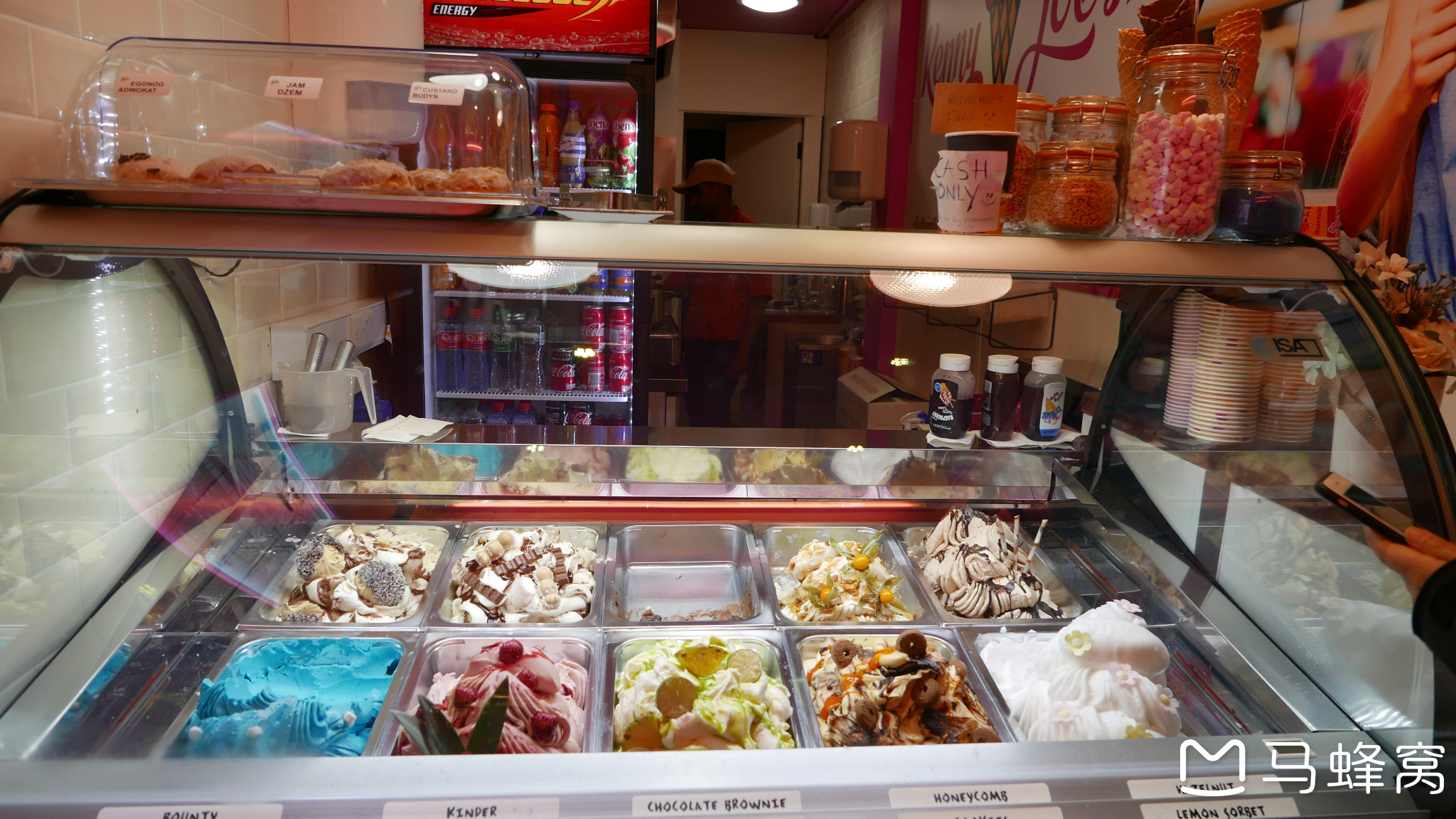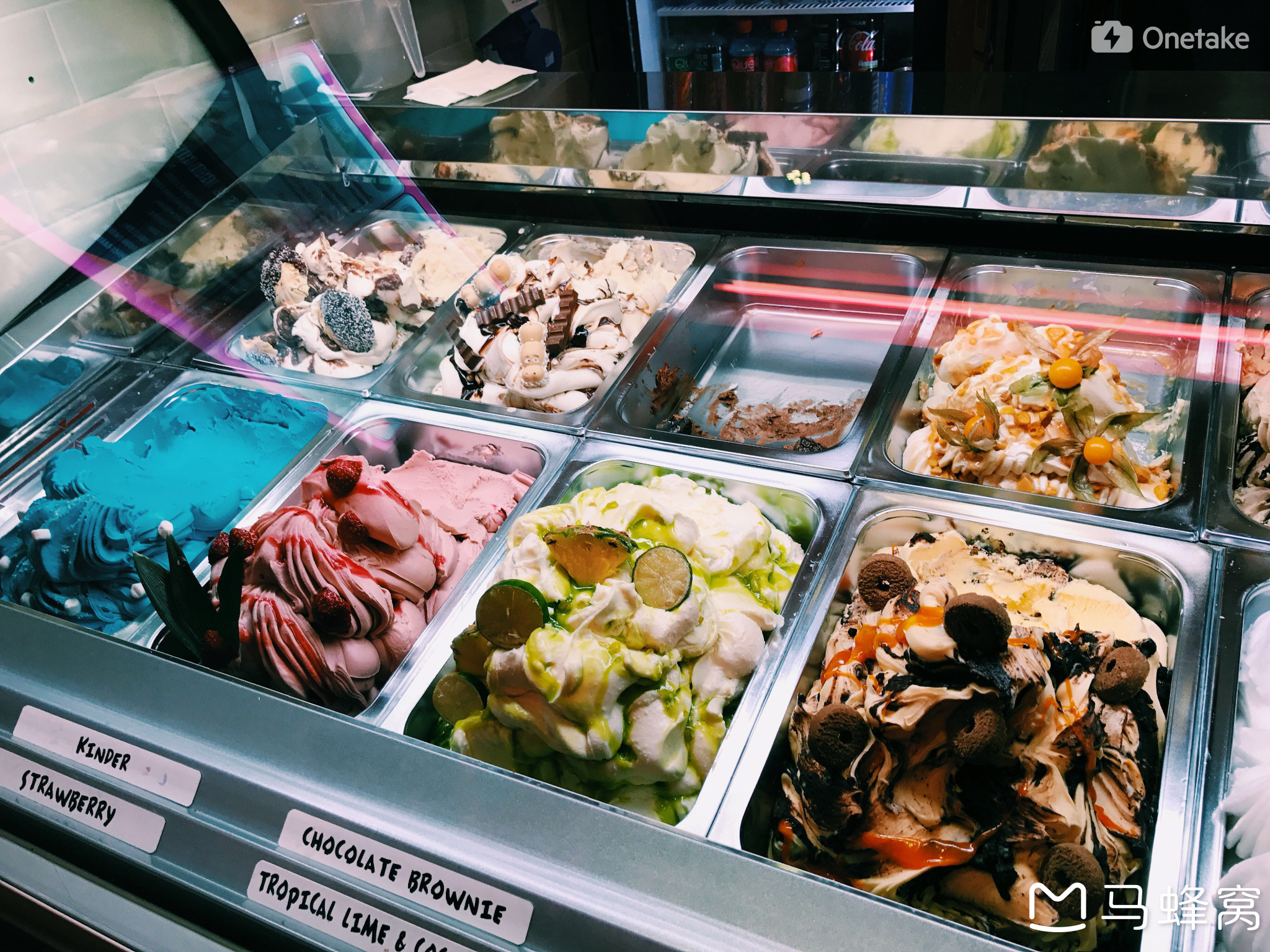 冰淇淋店里灯火通明喧声笑语,花花绿绿的冰淇淋色泽艳丽不停地勾人食欲