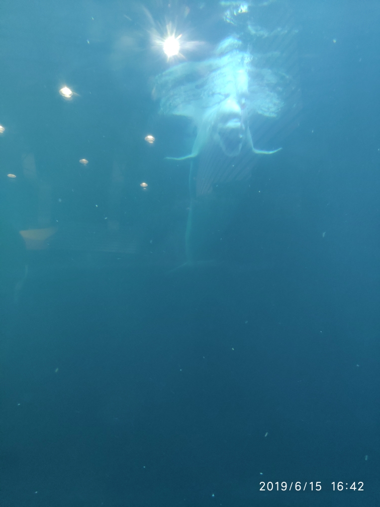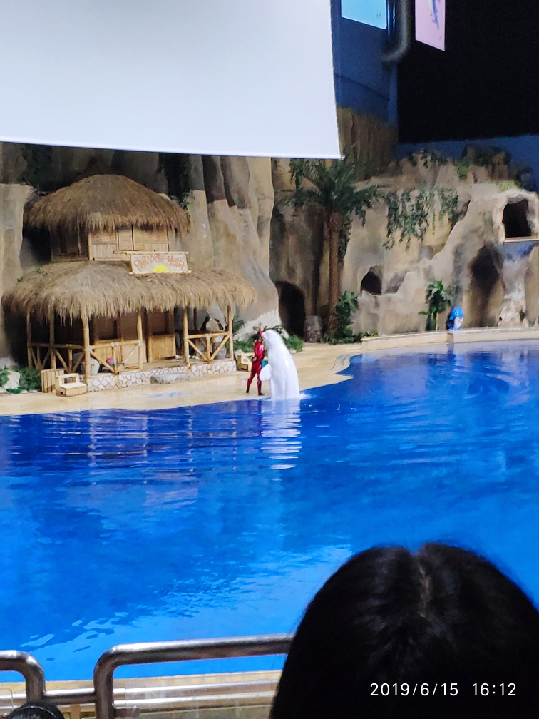 白鲸表演完,会在海洋馆的另一个池子里,游客从池子边的玻璃可以看到白鲸在水底的样子