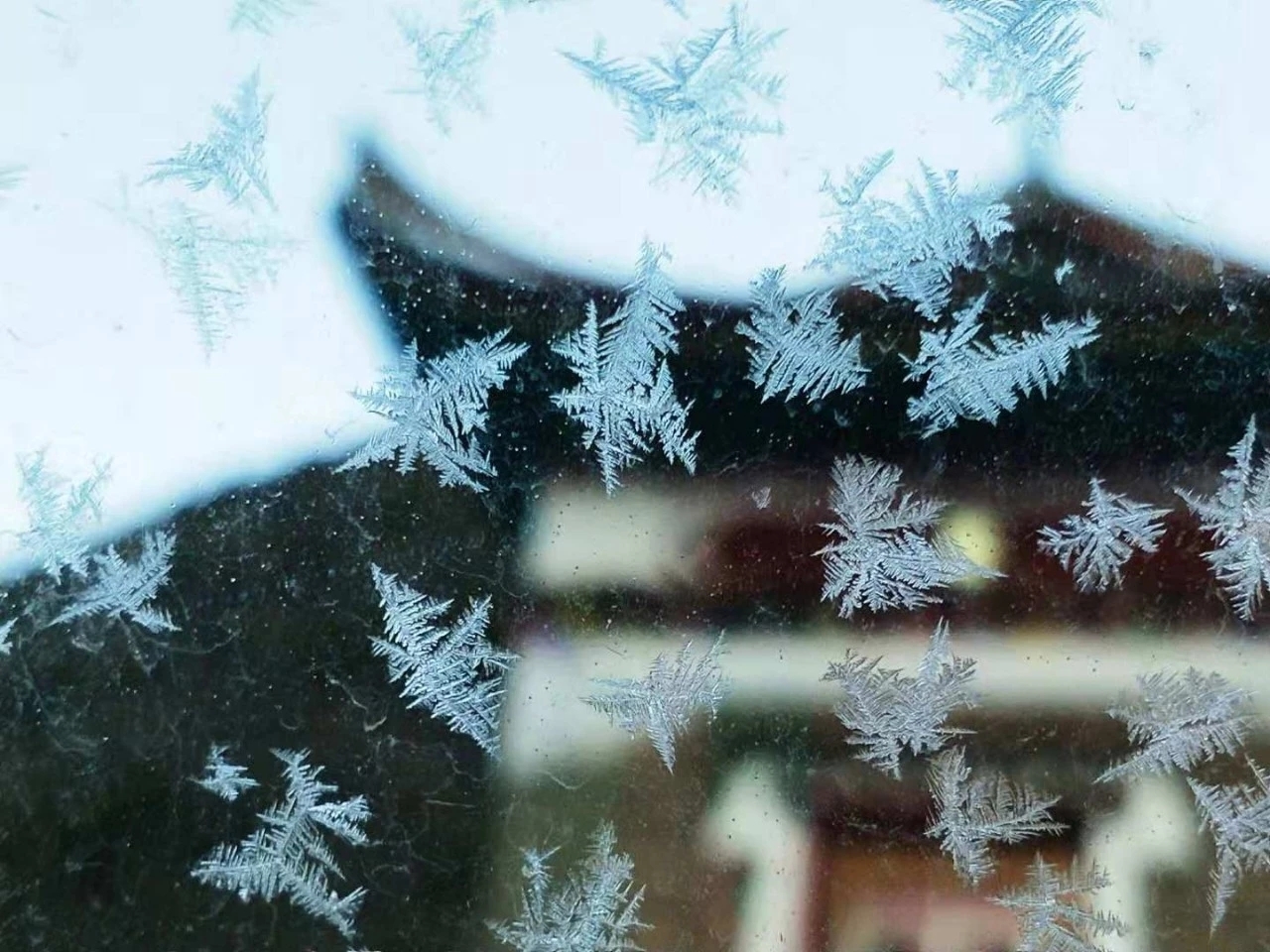 山乡,这里的温度已经在0°C 以下,裸露的手背一接触到空气便冻得生疼,对着空气哈气就能看见白白的雾气,瓦屋顶、院坝里、远处的山坡草丛到处都是积雪的痕迹。车窗上贴满了雪花,一朵,两朵,三朵......小小的角上生着几根形状别致,鹿角似的冰花就这样静静地躺在窗子上,