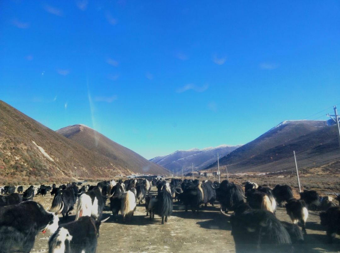 ∆被牦牛占据的马路,前方20米往左,那里就是帮木吉德村。