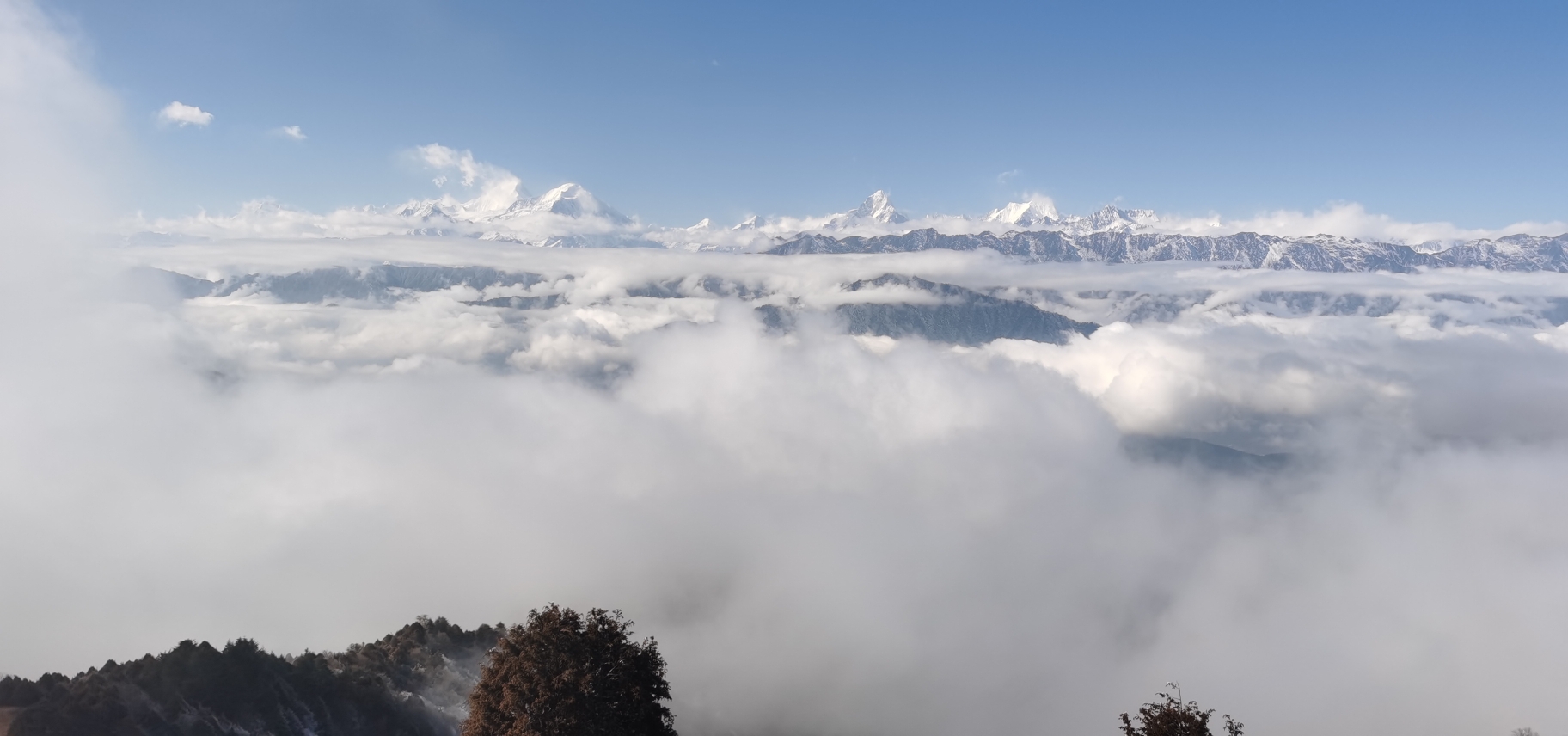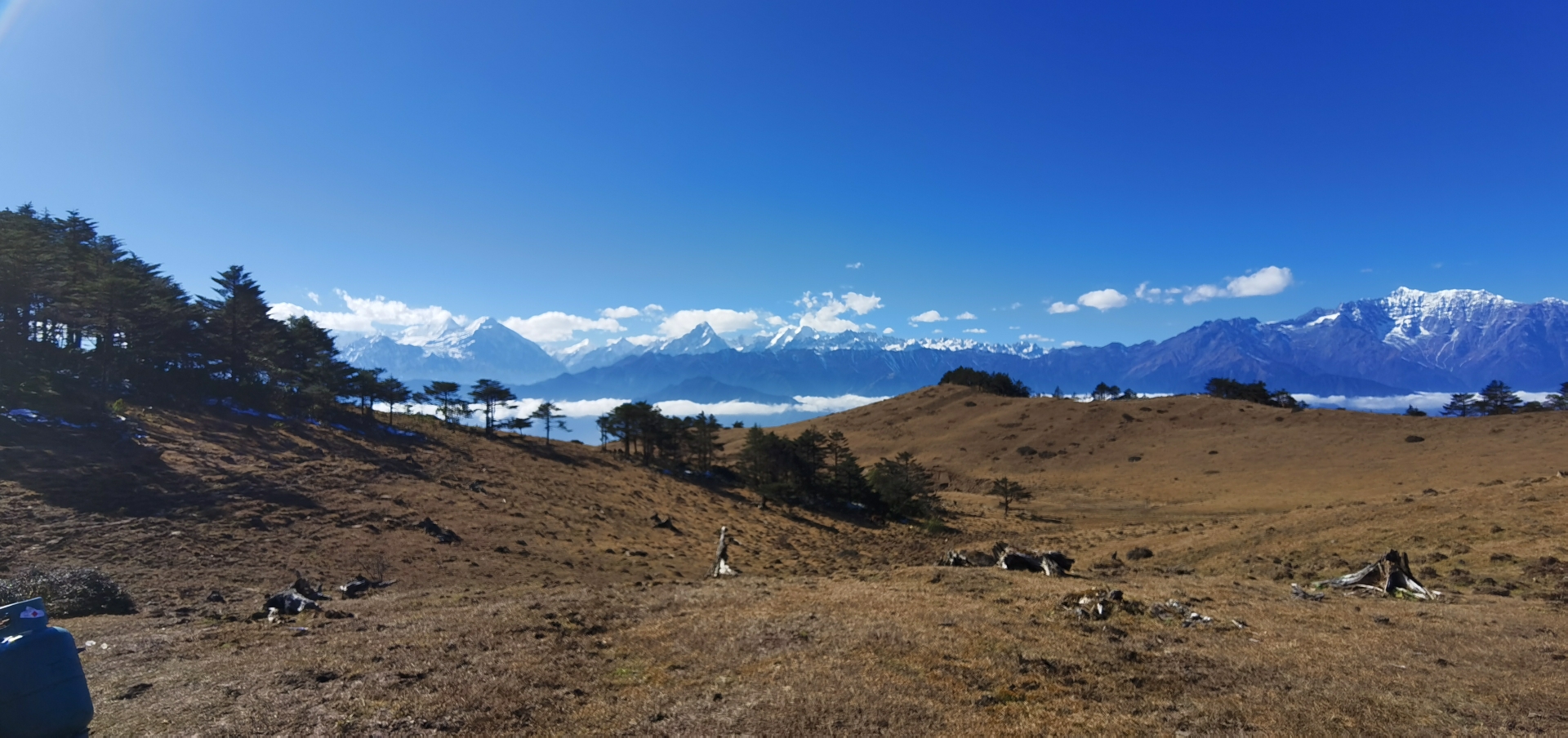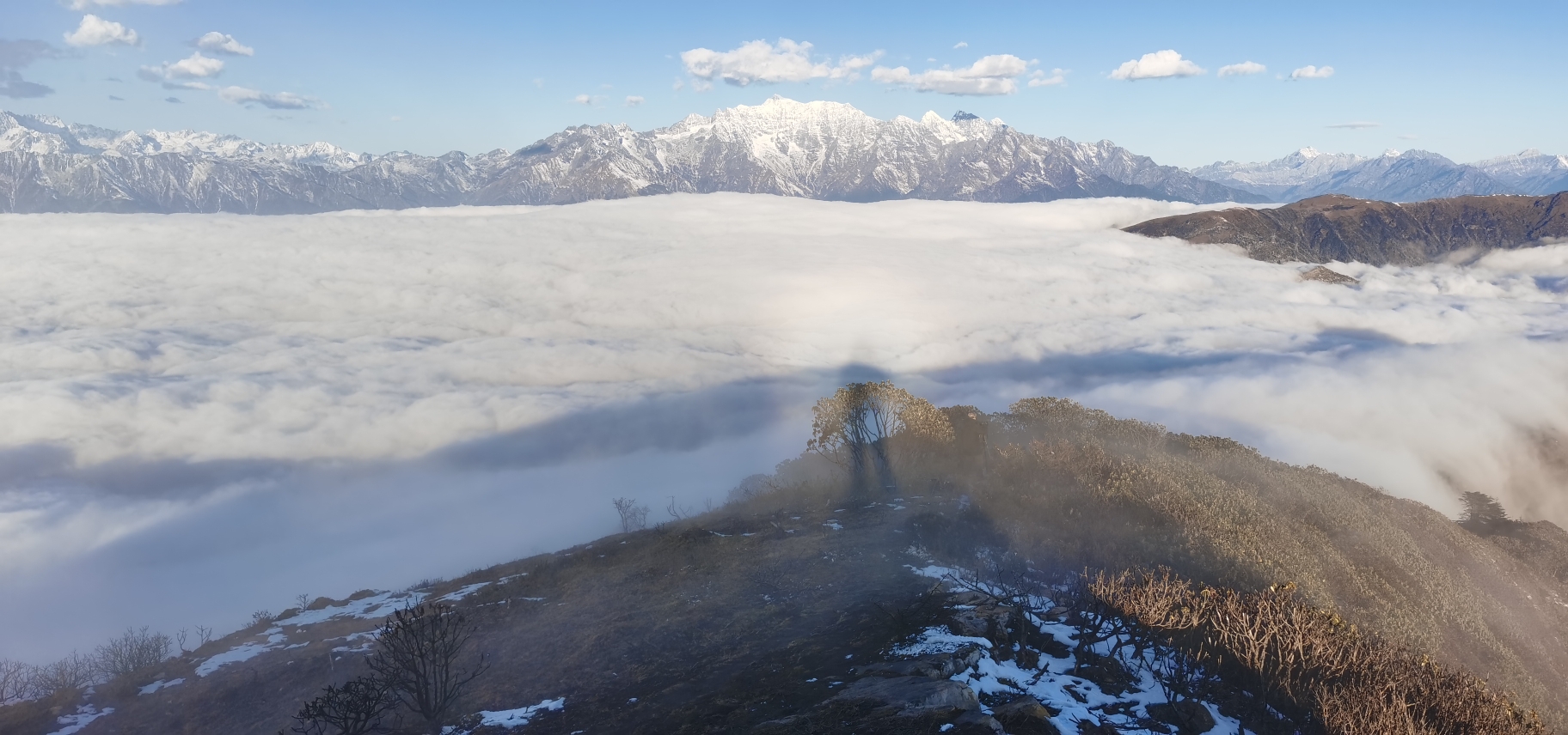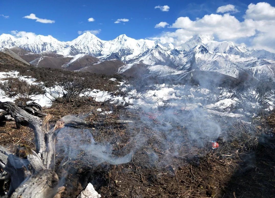 在冷嘎错旁的高地搭建的有专为看日照金山的帐篷,里面左侧平铺一排垫子,两张桌子,门口有从不熄灭的堆火,白色的烟雾妖娆着在群山里散开,若是顺着风就可以飘到云朵上。